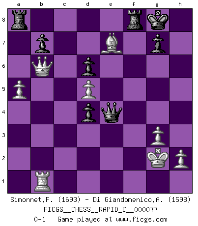 Last move : 0-1 2009 October 1 19:45:29 [Event "FICGS__CHESS__RAPID_C__000077"] [Site "FICGS"] [Date "2009.08.30"] [Round "1"] [White "Simonnet,Franck"] [Black "Di Giandomenico,Alfonso"] [Result "0-1"] [WhiteElo "1693"] [BlackElo "1598"] 1.d4 Nf6 2.c4 e6 3.Nc3 c5 4.d5 exd5 5.cxd5 d6 6.e4 Bg4 7.f3 Bh5 8.Bb5+ Nbd7 9.Nge2 a6 10.Bxd7+ Nxd7 11.a4 Be7 12.O-O O-O 13.Nf4 Bg6 14.Nxg6 fxg6 15.Be3 Bf6 16.Qe2 Qe7 17.Rab1 Be5 18.Bd2 Qh4 19.g3 Qe7 20.b4 Bd4+ 21.Kg2 Rae8 22.b5 axb5 23.Nxb5 Be5 24.Nc7 Rb8 25.Ne6 Rfe8 26.Bg5 Qf7 27.Qb5 Nf8 28.Nxf8 Rxf8 29.f4 Bd4 30.Qb6 Qd7 31.a5 Ra8 32.Rfd1 h6 33.Bh4 g5 34.Rxd4 cxd4 35.fxg5 hxg5 36.Bxg5 Qg4 37.Be7 Qxe4+ 0-1 Queen's pawn game Kingside Castling by player White (move 12) Kingside Castling by player Black (move 12) Player Black won this chess game. Follow this game move after move (download)Look at Garry Kasparov. After he loses, invariably he wins the next game. He just kills the next guy. That's something that we have to learn to be able to do. (Maurice Ashley) Über Karpov: Er war und ist ein Vertreter der russischen Reaktionäre. Das steckt tief in seiner Seele, wehalb ich nicht nett mit ihm umgehen kann. (Viktor Kortschnoi) El Ajedrez es tan interesante por sí solo, que no es necesario un interés monetario para persuadir a una persona a que lo practique; por lo tanto, nunca se juega por dinero. (Benjamin Franklin) Des combinaisons [dans le jeu d'échecs] pareilles à des mélodies. Je crois entendre pour ainsi dire la musique des coups... (Vladimir Nabokov) The arrogant army will lose certainly the battle. (Chinese proverb)