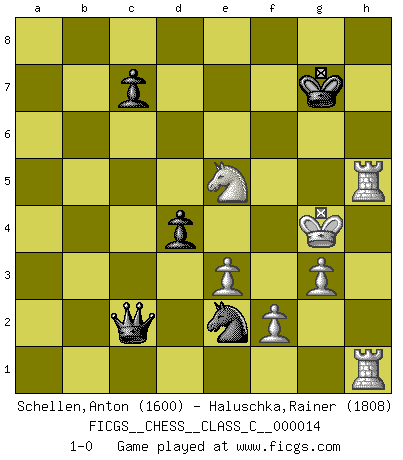 Last move : 1-0 2007 July 17 18:14:17 [Event "FICGS__CHESS__CLASS_C__000014"] [Site "FICGS"] [Date "2006.09.23"] [Round "1"] [White "Schellen,Anton"] [Black "Haluschka,Rainer"] [Result "1-0"] [WhiteElo "1600"] [BlackElo "1808"] 1.d4 Nf6 2.Bf4 g6 3.Nf3 Bg7 4.e3 d6 5.Nc3 Nh5 6.Bg5 h6 7.Bh4 Be6 8.Nd2 Nc6 9.Be2 Bf6 10.Bxf6 Nxf6 11.O-O d5 12.Na4 O-O 13.c4 dxc4 14.Nc5 Qc8 15.Rc1 Rd8 16.Nxe6 Qxe6 17.Nxc4 Nd5 18.Bf3 Rab8 19.Nd2 Qd6 20.Nc4 Qe6 21.Qb3 Kg7 22.Rfd1 f5 23.Nd2 Qd6 24.a3 e6 25.Qc2 Kh8 26.b4 a6 27.Nc4 Qf8 28.Nb2 g5 29.Nd3 Qf7 30.Nc5 Rd6 31.Re1 g4 32.Be2 h5 33.Qb2 Qf6 34.b5 axb5 35.Bxb5 R6d8 36.Rb1 e5 37.Bxc6 bxc6 38.Qxb8 Rxb8 39.Rxb8+ Kh7 40.Nd7 Qd6 41.Nxe5 Qxa3 42.g3 Qa5 43.Rf1 c5 44.Rf8 Nc3 45.Rxf5 Ne2+ 46.Kg2 cxd4 47.h4 gxh3+ 48.Kxh3 Kg7 49.Rg5+ Kf6 50.Rxh5 Qc3 51.Rd1 Kg7 52.Kg4 Qc2 53.Rdh1 1-0 Comment by player 1 : Anton Schellen : I don't understand this attitude.... He losed this game but he do not play. Allways the same..... Queen's pawn game Kingside Castling by player White (move 11) Kingside Castling by player Black (move 12) Player White won this chess game. Follow this game move after move (download)If your opponent cannot do anything active, then don't rush the position; instead you should let him sit there, suffer, and beg you for a draw. (Jeremy Silman) Ich war zu klein für die Schach-Schülermannschaft! (Woody Allen) En la perfecta combinación de Ajedrez como en una historia corta de primera clase, toda la trama y contra trama deberá conducir hacia un final sorprendente, el interes no es mitigado hasta el último momento. (Yates and Winter) Les échecs sont utiles à l'exercice de la faculté de penser et à celle de l'imagination. Car nous devons posséder une méthode élaborée pour atteindre des buts partout où nous devons conduire notre raison. (Leibnitz) Big Chess is a place for big hallucinations. (Thibault de Vassal)