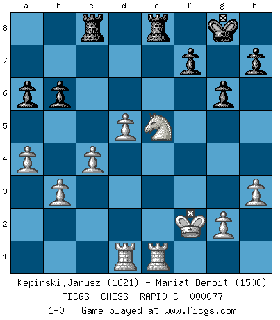 Last move : 1-0 2009 November 2 20:4:4 [Event "FICGS__CHESS__RAPID_C__000077"] [Site "FICGS"] [Date "2009.08.30"] [Round "1"] [White "Kepinski,Janusz"] [Black "Mariat,Benoit"] [Result "1-0"] [WhiteElo "1621"] [BlackElo "1500"] 1.e4 b6 2.d4 Bb7 3.Nc3 g6 4.Nf3 Bg7 5.Be2 d6 6.O-O Nd7 7.Re1 e5 8.d5 Ne7 9.Bg5 O-O 10.Bb5 Nf6 11.a4 a6 12.Bd3 c6 13.dxc6 Bxc6 14.Bxf6 Bxf6 15.h3 Re8 16.Qe2 Bb7 17.b3 Qc7 18.Qd2 Rac8 19.Bc4 d5 20.Nxd5 Nxd5 21.Bxd5 Bxd5 22.exd5 e4 23.Nd4 Qd6 24.c4 Qe5 25.Rad1 Bg5 26.Qc2 e3 27.Nf3 exf2+ 28.Qxf2 Be3 29.Nxe5 Bxf2+ 30.Kxf2 1-0 Owen defense Kingside Castling by player White (move 6) Kingside Castling by player Black (move 9) Player White won this chess game. Follow this game move after move (download)If Chess is a science, it's a most inexact one. If Chess is an art, it is too exacting to be seen as one. If Chess is a sport, it's too esoteric. If Chess is a game, it's too demanding to be just a game. If Chess is a mistress, she's a demanding one. If Chess is a passion, it's a rewarding one. If Chess is life, it's a sad one. (Unknown) Man wirke der falschen Auffassung entgegen, als ob jeder Zug Unmittelbares zu leisten habe; auch Werte- und Ruhezüge haben ihre Existenzberechtigung. (Aaron Nimzowitsch) En el Ajedrez, cuando menos, el valiente hereda la tierra. (Edmar Mednis) Roi des jeux et jeu des rois, les échecs portent en eux un sentiment d'infini. Ils donnent à celui qui s'est efforcé d'en approfondir les arcanes l'impression de n'être pas à la mesure de l'homme; en fait, ils constituent un résumé de l'univers, un microcosme, et figurent cette grande échelle qui, dans les plans de la lumière descend jusqu'à la matière, qui des abîmes insondables remonte jusqu'en l'infini de Dieu. (Pyrame) You must have a dream in order to have it come true. (A.P.J. Kalam)