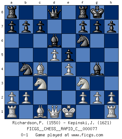 Last move : 0-1 2009 September 18 21:30:5 [Event "FICGS__CHESS__RAPID_C__000077"] [Site "FICGS"] [Date "2009.08.30"] [Round "1"] [White "Richardson,Patrick"] [Black "Kepinski,Janusz"] [Result "0-1"] [WhiteElo "1550"] [BlackElo "1621"] 1.d4 d5 2.c4 Nc6 3.Nc3 dxc4 4.e3 e5 5.d5 Nb4 6.e4 Bd6 7.Nf3 Bg4 8.Be2 Nf6 9.Bxc4 O-O 0-1 QGD : Chigorin defense Kingside Castling by player Black (move 9) Player Black won this chess game. Follow this game move after move (download)You cannot play at Chess if you are kind-hearted. (French Proverb) Darum geht es im Schach. Einen Tag gibst du deinem Gegner eine Lektion, am nächsten Tag gibt er dir eine. (Robert James Fischer) Fischer sacrificó virtualmente todo lo que la mayoría de nosotros los 'debiles' (término que él usa) valoramos, respetamos y apreciamos por el amor de un astuto, a menudo hermoso tablero de juego, por el privilegio ambivalente de ser su mas grande maestro. (Paul Kollar) Que feriez-vous si vous étiez en train de jouer aux échecs et que la fin du monde arrive ? Je continuerais à jouer. (Saint Borromée) Indecision is the key to flexibility. (Unknown)
