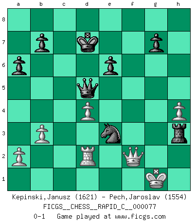 Last move : 0-1 2009 December 8 18:47:10 [Event "FICGS__CHESS__RAPID_C__000077"] [Site "FICGS"] [Date "2009.08.30"] [Round "1"] [White "Kepinski,Janusz"] [Black "Pech,Jaroslav"] [Result "0-1"] [WhiteElo "1621"] [BlackElo "1554"] 1.Nf3 d5 2.b3 c5 3.e3 Nc6 4.d4 Nf6 5.Bb5 Qa5+ 6.Nc3 Qxc3+ 7.Bd2 Qb2 8.Ne5 Bd7 9.Nd3 Qa3 10.Nxc5 e6 11.Nxd7 Kxd7 12.O-O Bd6 13.c4 dxc4 14.Qc2 c3 15.Bxc3 Rac8 16.e4 a6 17.Bxc6+ Rxc6 18.e5 Nd5 19.exd6 Rxc3 20.Qe4 Qxd6 21.g3 h5 22.h4 Rhc8 23.Rfe1 f5 24.Qe2 f4 25.Qxh5 fxg3 26.Qf7+ Ne7 27.Re3 gxf2+ 28.Qxf2 Nf5 29.Rxc3 Rxc3 30.Rd1 Rg3+ 31.Kh1 Ne3 32.Rd2 Rh3+ 33.Kg1 Qd5 0-1 Reti : Nimzovich-Larsen attack Kingside Castling by player White (move 12) Player Black won this chess game. Follow this game move after move (download)There just isn't enough televised Chess. (David Letterman) Im Wettkampf zwischen starken Meistern kommen Fehler sehr selten vor, deshalb ist es mit bloßem Warten nicht getan. (José Raúl Capablanca) Con el tiempo, empecé a progresar en partidas decisivas. Tal vez porque me di cuenta de una simple verdad: no solo estaba yo nervioso sino también mi oponente. (Mikhail Tal) Les écrivains ont utilisé les échecs pour analyser les côtés extrêmes de la nature humaine. Dans ce cadre, les échecs offrent un champ d'expérimentation idéal. Mais on pourrait faire la même chose avec la peinture. Et là, en vous référant à Van Gogh, vous ne tirerez pas de conclusion définitive sur les peintres. (Gary Kasparov) There are lots of people who mistake their imagination for their memory. (Josh Bilings)