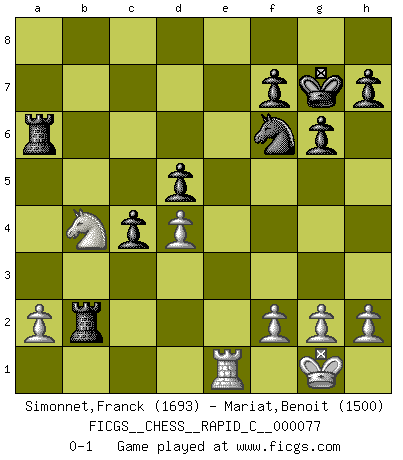 Last move : 0-1 2009 October 4 11:56:33 [Event "FICGS__CHESS__RAPID_C__000077"] [Site "FICGS"] [Date "2009.08.30"] [Round "1"] [White "Simonnet,Franck"] [Black "Mariat,Benoit"] [Result "0-1"] [WhiteElo "1693"] [BlackElo "1500"] 1.d4 g6 2.c4 Bg7 3.Nc3 b6 4.Nf3 Bb7 5.e4 e6 6.Bd3 Ne7 7.O-O O-O 8.Bf4 d6 9.Qd2 Nd7 10.Bh6 Re8 11.Bxg7 Kxg7 12.b4 d5 13.cxd5 exd5 14.e5 c5 15.bxc5 bxc5 16.Nb5 Nc8 17.Rfe1 a6 18.Nd6 Nxd6 19.exd6 c4 20.Bc2 Nf6 21.Qb4 Rb8 22.Ne5 Re6 23.Rab1 Qxd6 24.Qxd6 Rxd6 25.Ba4 R6d8 26.Rb6 Ba8 27.Rxa6 Rb2 28.Bc6 Bxc6 29.Nxc6 Rd6 30.Nb4 Rxa6 0-1 Modern defense Kingside Castling by player White (move 7) Kingside Castling by player Black (move 7) Player Black won this chess game. Follow this game move after move (download)One bad move nullifies forty good ones. (Horowitz) Ein Buch ist ein Spiegel; wenn ein Affe hineinsieht, so kann kein Apostel heraus gucken. (Georg Christoph Lichtenberg) Un Peón pasado aumenta su poder a medida de que el número de piezas en el tablero disminuye. (Capablanca) La guerre est enfant de la passion, la passion est enfant du narcissisme et le narcissisme est l'enfant. (...) Une autre partie ? (Thibault de Vassal) Those who make the worst use of their time are the first to complain of its brevity. (Jean de la Bruyere)