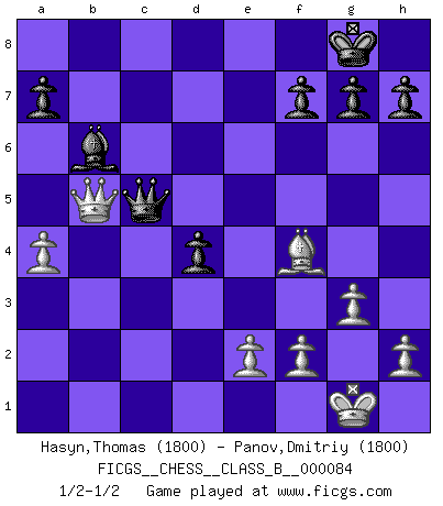Last move : 1/2-1/2 2009 October 7 18:16:5 [Event "FICGS__CHESS__CLASS_B__000084"] [Site "FICGS"] [Date "2009.08.30"] [Round "1"] [White "Hasyn,Thomas"] [Black "Panov,Dmitriy"] [Result "1/2-1/2"] [WhiteElo "1800"] [BlackElo "1800"] 1.d4 Nf6 2.Nf3 e6 3.c4 b6 4.g3 Bb7 5.Bg2 Be7 6.O-O O-O 7.Nc3 d5 8.Ne5 Nbd7 9.cxd5 Nxd5 10.Nxd5 exd5 11.Nd3 Rc8 12.b4 c5 13.bxc5 bxc5 14.Rb1 Ba8 15.dxc5 Nxc5 16.Nxc5 Bxc5 17.Qd3 d4 18.Bxa8 Rxa8 19.Bf4 Bb6 20.Rfc1 Rc8 21.Rxc8 Qxc8 22.Rc1 Qe6 23.a4 Rc8 24.Rxc8+ Qxc8 25.Qb5 Qc5 1/2-1/2 Queen's pawn game Kingside Castling by player White (move 6) Kingside Castling by player Black (move 6) This chess game ended in a draw. Follow this game move after move (download)The isolated Pawn casts gloom over the entire chessboard. (Aaron Nimzovich) Der Verteidiger gebe der Gewalt nach, aber nur der Gewalt. Er schaffe sich nicht freiwillig, etwa aus Blindheit oder aus Schrecken, irgendwelche Schwächen. Er lasse sich nicht bluffen. (Emanuel Lasker) El Ajedrez es el gimnasio de la mente. (Blaise Pascal) Horreur, mais aussi harmonie suprême : qu'y avait-il en effet au monde en dehors des échecs ? Le brouillard, l'inconnu, le non-être... (Vladimir Nabokov) The next best thing to gambling and winning is gambling and loosing. (Nick Dandalos)