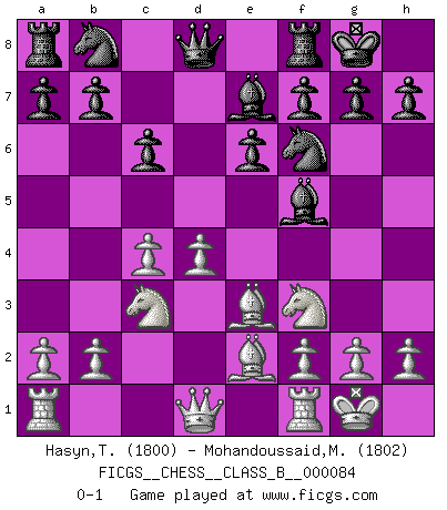 Last move : 0-1 2009 November 12 8:43:17 [Event "FICGS__CHESS__CLASS_B__000084"] [Site "FICGS"] [Date "2009.08.30"] [Round "1"] [White "Hasyn,Thomas"] [Black "Mohandoussaid,Malik"] [Result "0-1"] [WhiteElo "1800"] [BlackElo "1802"] 1.e4 d5 2.exd5 Nf6 3.d4 Nxd5 4.Nf3 Bf5 5.Be2 e6 6.O-O Be7 7.c4 Nf6 8.Nc3 O-O 9.Be3 c6 0-1 This chess game has been lost on time (started : 2009.08.30 19:27:34) Scandinavian : Marshall variation Kingside Castling by player White (move 6) Kingside Castling by player Black (move 8) Player Black won this chess game. Follow this game move after move (download)Fischer wanted to give the Russians a taste of their own medicine. (Larry Evans) Ich las kürzlich ein Buch von Nietzsche. Er sagte Religion verdumme nur die Menschen. Ich stimme zu. (Robert James Fischer) El Ajedrez es una hermosa aventura. (Bent Larsen) Tous ces prétendus hommes politiques sont les pions, les Cavaliers, les Tours ou les Fous d'une partie d'échecs qui se jouera tant qu'un hasard ne renversera pas l'échiquier. (Honoré de Balzac) It is not titles that honor men, but men that honor titles. (Niccolo Machiavelli)