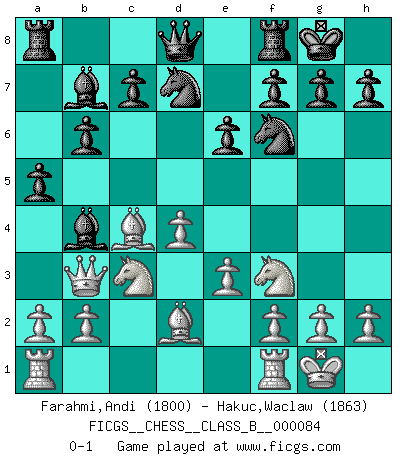 Last move : 0-1 2009 December 9 9:31:7 [Event "FICGS__CHESS__CLASS_B__000084"] [Site "FICGS"] [Date "2009.08.30"] [Round "1"] [White "Farahmi,Andi"] [Black "Hakuc,Waclaw"] [Result "0-1"] [WhiteElo "1800"] [BlackElo "1863"] 1.d4 Nf6 2.c4 e6 3.Nf3 d5 4.Nc3 Nbd7 5.e3 Bb4 6.Qb3 a5 7.Bd2 O-O 8.Bd3 dxc4 9.Bxc4 b6 10.O-O Bb7 0-1 This chess game has been lost on time (started : 2009.08.30 19:27:34) Queen's pawn game Kingside Castling by player Black (move 7) Kingside Castling by player White (move 10) Player Black won this chess game. Follow this game move after move (download)Pawns: they are the soul of this game, they alone form the attack and defense. (Philidor) Die Arbeit ist etwas Unnatürliches. Die Faulheit allein ist göttlich. (Anatole France) La esencia del Ajedrez es pensar acerca de lo que el Ajedrez es. (David Bronstein) Dieu déplace le joueur, et celui-ci la pièce. Quel Dieu derrière Dieu commence donc la trame ? Arturo Perez-Reverte (prix de littérature policière 1993). If everyone is thinking alike, then somebody isn't thinking. (US General George S. Patton)