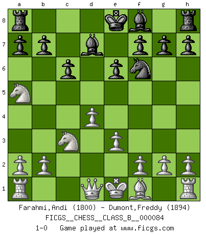 Last move : 1-0 2009 October 29 16:29:28 [Event "FICGS__CHESS__CLASS_B__000084"] [Site "FICGS"] [Date "2009.08.30"] [Round "1"] [White "Farahmi,Andi"] [Black "Dumont,Freddy"] [Result "1-0"] [WhiteElo "1800"] [BlackElo "1894"] 1.d4 Nf6 2.c4 c6 3.Nc3 d5 4.Nf3 e6 5.Bg5 Nbd7 6.e3 Qa5 7.Nd2 dxc4 8.Bxf6 Nxf6 9.Nxc4 Bd7 10.Nxa5 1-0 Queen's pawn game Player White won this chess game. Follow this game move after move (download)You know, comrade Pachman, I don't enjoy being a Minister, I would rather play Chess like you. (Che Guevara) Schach ist ein Teil der Kultur, und wenn es mit der Kultur abwärts geht, geht es auch mit dem Schach abwärts. (Mikhail Moiseyevich Botvinik) Debes de llevar a tu oponente hacia un profundo y obscuro bosque donde 2+2=5, y el camino que conduce a la salida es suficientemente ancho para solamente uno. (Mikhail Tal) Le moment que je préfère le plus dans une rencontre, c'est celui où je sens que la personnalité de l'adversaire se brise. (Robert Fischer) I fear not the man who has practiced 10,000 kicks once, but I fear the man who has practiced one kick 10,000 times. (Bruce Lee)