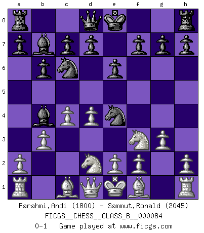Last move : 0-1 2009 December 13 20:37:26 [Event "FICGS__CHESS__CLASS_B__000084"] [Site "FICGS"] [Date "2009.08.30"] [Round "1"] [White "Farahmi,Andi"] [Black "Sammut,Ronald"] [Result "0-1"] [WhiteElo "1800"] [BlackElo "2045"] 1.d4 Nf6 2.c4 e6 3.Nf3 b6 4.g3 Ba6 5.b3 Bb4+ 6.Bd2 Be7 7.Bc3 Ne4 8.Bb2 Bb4+ 9.Nbd2 Bb7 10.Bc1 Nc6 0-1 This chess game has been lost on time (started : 2009.08.30 19:27:34) Queen's Indian : Nimzovich variation (exaggerated Fianchetto) Player Black won this chess game. Follow this game move after move (download)An attack on the wing should be met by play in the center. (Nimzovitch) Ich bewundere Kasparows phantasievolle Angriffssiege aus den Achtzigern und Neunzigern, aber wenn man sie mit dem Computer überprüft, nimmt der Computer in jeder zweiten Partie die Opfer an, verteidigt sich und gewinnt. (Vladimir Kramnik) Ciertamente, de todas la drogas del mundo, el Ajedrez debe ser el mas placentero permamentemente. (Assiac) Les Echecs sont affaire de jugement sensible. Savoir quand frapper et quand esquiver. (Fischer) If things go wrong, don't go with them. (Roger Babson)