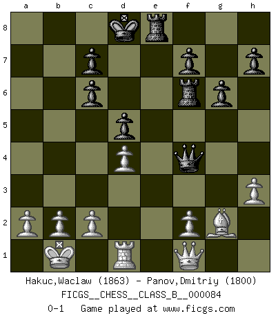 Last move : 0-1 2009 December 31 18:54:1 [Event "FICGS__CHESS__CLASS_B__000084"] [Site "FICGS"] [Date "2009.08.30"] [Round "1"] [White "Hakuc,Waclaw"] [Black "Panov,Dmitriy"] [Result "0-1"] [WhiteElo "1863"] [BlackElo "1800"] 1.e4 e5 2.Nf3 Nf6 3.Nxe5 d6 4.Nf3 Nxe4 5.Qe2 Qe7 6.d3 Nf6 7.Nc3 Bg4 8.Be3 Nc6 9.h3 Be6 10.d4 O-O-O 11.O-O-O Nd5 12.Nxd5 Bxd5 13.Qb5 Bxf3 14.gxf3 d5 15.Qa4 Qf6 16.Rg1 Qxf3 17.Rd3 g6 18.Rb3 Rd6 19.Bg2 Qf5 20.Qb5 Nd8 21.Rc3 a6 22.Qa5 Nc6 23.Qa4 Bg7 24.Rd1 Re8 25.Rc5 Bf6 26.Kb1 Bg5 27.Bxg5 Qxg5 28.Bf3 Qf4 29.Rc3 Qh2 30.Rxc6 bxc6 31.Qxa6+ Kd8 32.Qf1 Rf6 33.Bg2 Qf4 0-1 Petrov : Cozio (Lasker) attack Queenside Castling by player Black (move 10) Queenside Castling by player White (move 11) Player Black won this chess game. Follow this game move after move (download)Chess, like love, like music, has the power to make people happy. (Siegbert Tarrasch) Im Schach gewinnt jeder. Hat man Freunde am Spiel - und das ist die Hauptsache - ist auch der Verlust einer Partie kein Unglück. (David Bronstein) Robert Fischer es la ley hacia si mismo. (Larry Evans) Karpov est une pièce de musée. (Garry Kasparov) If you ain't just a little scared when you enter a casino, you are either very rich or you haven't studied the games enough. (Pappy)