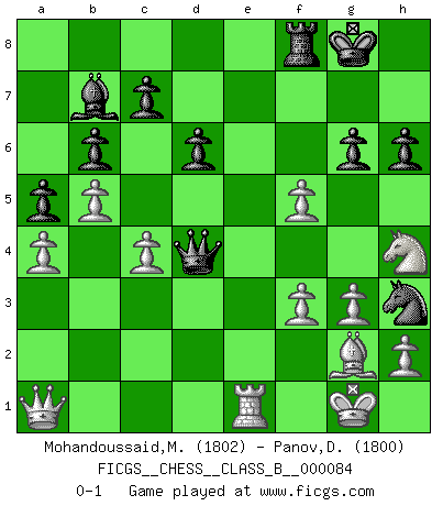 Last move : 0-1 2010 January 17 8:20:24 [Event "FICGS__CHESS__CLASS_B__000084"] [Site "FICGS"] [Date "2009.08.30"] [Round "1"] [White "Mohandoussaid,Malik"] [Black "Panov,Dmitriy"] [Result "0-1"] [WhiteElo "1802"] [BlackElo "1800"] 1.Nf3 Nf6 2.c4 e6 3.Nc3 b6 4.g3 Bb7 5.Bg2 Bb4 6.Qc2 O-O 7.O-O d6 8.d3 Bxc3 9.Qxc3 Nbd7 10.b4 Qe7 11.Bg5 h6 12.Bxf6 Nxf6 13.a4 a5 14.b5 e5 15.e4 Nd7 16.Nh4 g6 17.d4 exd4 18.Qxd4 Rae8 19.Rfe1 Nc5 20.Qe3 Qf6 21.f3 Qg7 22.Qa3 f5 23.exf5 Qd4+ 24.Kh1 Rxe1+ 25.Rxe1 Nd3 26.Qa1 Nf2+ 27.Kg1 Nh3+ 0-1 This chess game has been lost on time (started : 2009.08.30 19:27:34) Reti Opening Kingside Castling by player Black (move 6) Kingside Castling by player White (move 7) Player Black won this chess game. Follow this game move after move (download)Could we look into the head of a Chess player, we should see there a whole world of feelings, images, ideas, emotion and passion. (Alfred Binet) Die größte Kunst beim Schach besteht darin dem Gegner nicht zu zeigen was er tun kann. (Garry Kasparov) Una victoria por una combinación errónea, aunque sea espectacular, me llena de horror artístico. (Wilhelm Steinitz) Dans le domaine de la peinture, de la gravure et de la sculpture, dès la première décennie de notre siècle, les artistes abandonnent la représentation de la partie d'échecs pour se concentrer sur les pièces, sur les échiquiers et sur toutes les variations auxquelles les unes et les autres peuvent donner lieu. On passe en quelque sorte d'un thème social à un thème musical (au sens de la musica médiévale, c'est-à-dire d'une notion qui inclue le rythme, l'harmonie, la construction et la déconstruction, etc.). Graphiquement et picturalement, l'échiquier apparaît comme une structure ouverte, dynamique, d'une richesse infinie, autorisant toutes les combinatoires et débouchant sur des mouvements et des rythmes de nature exponentielle. (Michel Pastoureau) There are three kinds of lies: lies, damned lies and statistics. (Mark Twain)