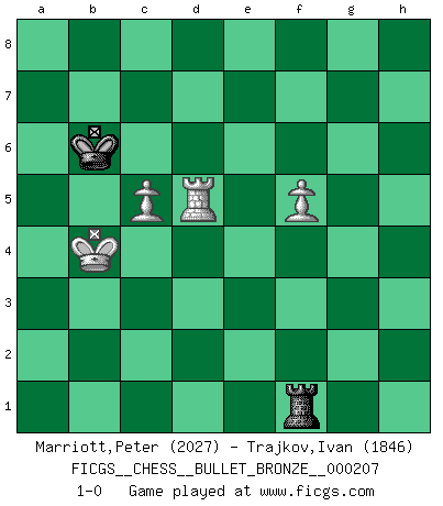 Last move : 1-0 2010 April 13 2:25:57 [Event "FICGS__CHESS__BULLET_BRONZE__000207"] [Site "FICGS"] [Date "2010.04.13"] [Round "1"] [White "Marriott,Peter"] [Black "Trajkov,Ivan"] [Result "1-0"] [WhiteElo "2027"] [BlackElo "1846"] 1.Nf3 d5 2.d4 Nf6 3.Bf4 c5 4.e3 Nc6 5.Nc3 Bg4 6.Qd2 Bxf3 7.gxf3 cxd4 8.exd4 e6 9.O-O-O Nh5 10.Bg5 Qa5 11.a3 Rb8 12.Ne2 Bd6 13.Kb1 h6 14.Be3 b5 15.Qxa5 Nxa5 16.Bc1 Nc4 17.Ka2 O-O 18.Rg1 Kh8 19.Ng3 Nf6 20.h4 Rfc8 21.Bd3 b4 22.axb4 Bxb4 23.Ne2 Bd6 24.b3 Rc6 25.Rg2 Ra6+ 26.Kb1 Ra5 27.h5 e5 28.Rdg1 Bf8 29.Rh1 Rb6 30.Rg3 Rba6 31.Bb2 Ba3 32.Bxc4 dxc4 33.Bc3 Bb4 34.Bb2 Bd6 35.Rhg1 Nxh5 36.Rh3 exd4 37.bxc4 Nf4 38.Nxf4 Bxf4 39.Bxd4 Be5 40.Rg4 f5 41.Rgh4 Kg8 42.Bxe5 Rxe5 43.Rd4 Rc6 44.Kb2 Kf7 45.Kc3 Ke7 46.f4 Rec5 47.Re3+ Kf7 48.Re5 Rxe5 49.fxe5 Ke6 50.Rd5 h5 51.Kd4 h4 52.Ra5 a6 53.f4 Kf7 54.Ra3 Rc8 55.c5 Rd8+ 56.Kc4 Rd2 57.Rc3 Ke7 58.c6 Kd8 59.e6 Rd6 60.e7+ Kxe7 61.Kc5 Rd1 62.Rb3 Rc1 63.Rb7+ Kd8 64.Kb6 Kc8 65.Rc7+ Kd8 66.Rxg7 Rb1+ 67.Kc5 Kc8 68.Rh7 Rh1 69.Kb6 Rb1+ 70.Kxa6 h3 71.c3 h2 72.Rxh2 Kc7 73.Rh6 Rb8 74.Rf6 Rb6+ 75.Ka5 Rb3 76.c4 Rb1 77.Rxf5 Kxc6 78.Rd5 Re1 79.Kb4 Rf1 80.f5 Rf3 81.Ra5 Kb6 82.Rc5 Rf2 83.Rd5 Rf1 84.c5+ 1-0 Reti Opening Queenside Castling by player White (move 9) Kingside Castling by player Black (move 17) 10 pieces endgame at move 66 : White KRPPP , Black KRPPP WHITE : King + 1 Rook 3 Pawns BLACK : King + 1 Rook 3 Pawns 9 pieces endgame at move 70 : White KRPPP , Black KRPP WHITE : King + 1 Rook 3 Pawns BLACK : King + 1 Rook 2 Pawns 8 pieces endgame at move 72 : White KRPPP , Black KRP WHITE : King + 1 Rook 3 Pawns BLACK : King + 1 Rook 1 Pawn 7 pieces endgame at move 77 : White KRPPP , Black KR WHITE : King + 1 Rook 3 Pawns BLACK : King + 1 Rook 6 pieces endgame at move 77 : White KRPP , Black KR WHITE : King + 1 Rook 2 Pawns BLACK : King + 1 Rook Player White won this chess game. Follow this game move after move (download)No other master has such a terrific will to win. At the board he radiates danger, and even the strongest opponents tend to freeze, like rabbits when they smell a panther. Even his weaknesses are dangerous. As white, his opening game is predictable - you can make plans against it - but so strong that your plans almost never work. In the middle game his precision and invention are fabulous, and in the end game you simply cannot beat him. (Anonymous German Expert) Kein Schachspieler kann gut schlafen. (H. G. Wells) El Ajedrez es en su esencia, un juego. En su forma, un arte. Y en su ejecución, una ciencia. (Baron Tassilo) Les échecs sont un jeu terrible. Si vous n'avez pas le centre, votre adversaire a une position plus libre. Par contre, si vous avez le centre, alors vous avez vraiment quelque chose pour laquelle vous inquiéter ! (Siegbert Tarrasch) He who fights with monsters should be careful lest he thereby become a monster. (Friedrich Nietzsche, Beyond Good and Evil)