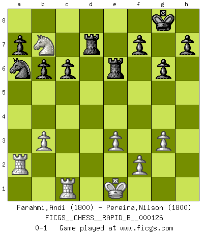 Last move : 0-1 2009 November 14 8:52:15 [Event "FICGS__CHESS__RAPID_B__000126"] [Site "FICGS"] [Date "2009.09.01"] [Round "1"] [White "Farahmi,Andi"] [Black "Pereira,Nilson"] [Result "0-1"] [WhiteElo "1800"] [BlackElo "1800"] 1.d4 Nf6 2.c4 e6 3.Nf3 d5 4.Nc3 c6 5.e3 Nbd7 6.Qc2 dxc4 7.Bxc4 Bd6 8.O-O O-O 9.Rd1 Qe7 10.a4 e5 11.b3 e4 12.Ng5 Bxh2+ 13.Kf1 Nb6 14.Ba3 Bd6 15.Ncxe4 Nxe4 16.Qxe4 Qxe4 17.Nxe4 Bxa3 18.Rxa3 Rd8 19.Be2 Nd5 20.a5 Bf5 21.Nc5 b6 22.Nb7 Rd7 23.a6 Re8 24.Bf3 g6 25.Rc1 Bd3+ 26.Be2 Bxe2+ 27.Kxe2 Re6 28.g3 Nc7 29.Ra2 Rxd4 30.Kf1 Rd7 31.Ke1 Nxa6 0-1 This chess game has been lost on time (started : 2009.09.01 8:58:45) Queen's pawn game Kingside Castling by player White (move 8) Kingside Castling by player Black (move 8) Player Black won this chess game. Follow this game move after move (download)Dazzling combinations are for the many, shifting wood is for the few. (Georg Kieninger) Schach ist das schnellste Spiel der Welt, weil man in jeder Sekunde Tausende von Gedanken ordnen muß. (Albert Einstein) En partidas rápidas, el Caballo es mas poderoso que el Alfil. (Vlastimil Hort) C'est une question de caractère, Beaucoup de gens perdent leur motivation très vite. D'autres, ils sont rares, peuvent la conserver très longtemps. J'aime les échecs, encore aujourd'hui je suis heureux d'analyser des parties. J'aime toujours gagner, je déteste encore perdre. Bien jouer est important pour mon intégrité intellectuelle et morale. Et puis les échecs vivent en ce moment une période historique grâce à Internet. Ils se développent dans les systèmes éducatifs à travers le monde. Ils sortent de leur ghetto, et c'est mon rôle de mener à bien cette révolution. (Gary Kasparov) War is the child of passion, passion is the child of narcissism and narcissism is the child. (...) Another game ? (Thibault de Vassal)