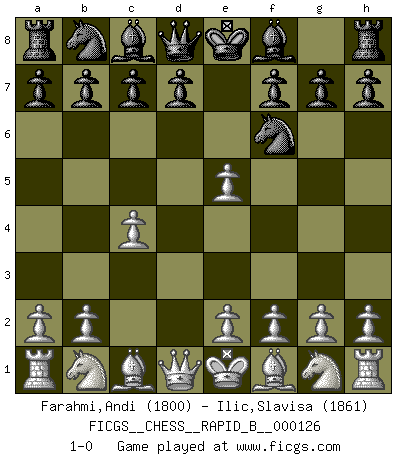 Last move : 1-0 2009 October 27 7:43:53 [Event "FICGS__CHESS__RAPID_B__000126"] [Site "FICGS"] [Date "2009.09.01"] [Round "1"] [White "Farahmi,Andi"] [Black "Ilic,Slavisa"] [Result "1-0"] [WhiteElo "1800"] [BlackElo "1861"] 1.d4 Nf6 2.c4 e5 3.dxe5 1-0 This chess game has been lost on time (started : 2009.09.01 8:58:45) Budapest defense declined Player White won this chess game. Follow this game move after move (download)Alekhine is a poet who creates a work of art out of something that would hardly inspire another man to send home a picture post card. (Max Euwe) Bobby Fischer ist kein Vorbild für die heutige Jugend. (Viktor Kortschnoi) Fischer no está bajo la obligación de nadie. (Joseph Platz) Tout change constamment, y compris dans le monde des Echecs. (Botvinnik) There is no instance of a country having benefited from prolonged warfare. (Sun Tzu)