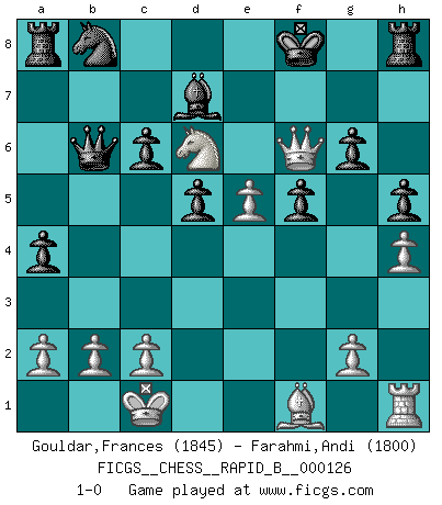 Last move : 1-0 2009 October 30 14:47:7 [Event "FICGS__CHESS__RAPID_B__000126"] [Site "FICGS"] [Date "2009.09.01"] [Round "1"] [White "Gouldar,Frances"] [Black "Farahmi,Andi"] [Result "1-0"] [WhiteElo "1845"] [BlackElo "1800"] 1.e4 e6 2.d4 d5 3.Nc3 Nf6 4.Bg5 Be7 5.e5 Nfd7 6.Bxe7 Qxe7 7.Nf3 c5 8.Nb5 Kd8 9.dxc5 Qxc5 10.Qd2 h6 11.O-O-O Nc6 12.Re1 a6 13.Nbd4 Ke7 14.Nxc6+ bxc6 15.Re3 a5 16.Nd4 Qb6 17.Rb3 Qc7 18.f4 Nb8 19.Rc3 Bd7 20.Nb5 Qb6 21.Nd6 a4 22.Rg3 g6 23.h4 h5 24.f5 exf5 25.Rxg6 fxg6 26.Qg5+ Kf8 27.Qf6+ 1-0 French : Classical variation Queenside Castling by player White (move 11) Player White won this chess game. Follow this game move after move (download)I played Chess with him and would have beaten him sometimes only he always took back his last move, and ran the game out differently. (Mark Twain) Wenn ich gewinne bin ich ein Genie. Wenn nicht, dann bin ich keines. (Robert James Fischer) ¿Se han dado cuenta de que Fischer casi nunca ha tenido piezas malas? El las intercambia y las piezas malas se quedan con sus oponenets. (Yuri Balashov) Le thème de l'attaque double intervient d'une manière ou d'une autre dans l'immense majorité des combinaisons. (Youri Averbakh) Mac users swear by their computers. PC users swear at their computers. (Author unknown)
