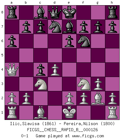 Last move : 0-1 2009 October 10 20:44:36 [Event "FICGS__CHESS__RAPID_B__000126"] [Site "FICGS"] [Date "2009.09.01"] [Round "1"] [White "Ilic,Slavisa"] [Black "Pereira,Nilson"] [Result "0-1"] [WhiteElo "1861"] [BlackElo "1800"] 1.d4 Nf6 2.Nf3 d5 3.c4 e6 4.g3 dxc4 5.Qa4+ Nbd7 6.Bg2 a6 7.Nc3 Be7 0-1 This chess game has been lost on time (started : 2009.09.01 8:58:45) Queen's pawn game Player Black won this chess game. Follow this game move after move (download)Examine moves that smite! A good eye for smites is far more important than a knowledge of strategical principles. (Purdy) Mein Gehirn das ist mein zweitwichtigstes Organ [Aus dem Film: Der Schläfer]. (Woody Allen) Si tu oponente no puede hacer nada activo, entonces no apures la posición; En vez de eso, dejalo estar sentado ahí, sufriendo y rogandote por un empate. (Jeremy Silman) La tactique, c'est ce que vous faites quand il y a quelque chose à faire; la stratégie, c'est ce que vous faites quand il n'y a rien à faire. (Savielli Tartacower) I believe in luck. How else can you explain the success of those you dislike ? (Jean Cocteau)