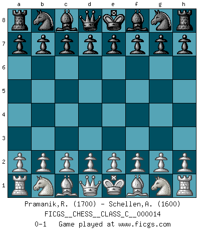 Last move : 0-1 2006 November 13 22:52:19 [Event "FICGS__CHESS__CLASS_C__000014"] [Site "FICGS"] [Date "2006.09.23"] [Round "1"] [White "Pramanik,Ranadeep"] [Black "Schellen,Anton"] [Result "0-1"] [WhiteElo "1700"] [BlackElo "1600"] 0-1 This chess game has been lost on time (started : 2006.09.23 15:11:39) Player Black won this chess game. Follow this game move after move (download)A sacrifice is best refuted by accepting it. (Wilhelm Steinitz) Es ist schade, dass viele Schachsportler vergessen, wie wichtig Auftreten und angemessene Kleidung sind. (Alexandra Kosteniuk) El sobresalir en el Ajedrez es un signo de una mente intrigante. (Sir Arthur Conan Doyle) Ce qui est bien, c'est d'avoir tout un tas de pièces en prise : l'adversaire ne peut en prendre qu'une à la fois. Cité par Thierry Audin. But they are useless. They can only give you answers. (Pablo Picasso, about computers)