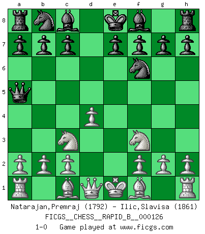 Last move : 1-0 2009 October 13 9:0:6 [Event "FICGS__CHESS__RAPID_B__000126"] [Site "FICGS"] [Date "2009.09.01"] [Round "1"] [White "Natarajan,Premraj"] [Black "Ilic,Slavisa"] [Result "1-0"] [WhiteElo "1792"] [BlackElo "1861"] 1.e4 d5 2.exd5 Qxd5 3.Nc3 Qa5 4.d4 Nf6 5.Nf3 1-0 This chess game has been lost on time (started : 2009.09.01 8:58:45) Scandinavian (centre counter) defense Player White won this chess game. Follow this game move after move (download)He who takes the Queen's Knight's Pawn will sleep in the streets. (Anonymous) Das ganze Leben mit einer Ehefrau ist wie ein Endspiel mit ungleichfarbigen Läufern. (Viktor Kortschnoi) Botvinnik trató de alejar el misterio referente al Ajedrez, siempre relacionandolo a situaciones de la vida diaria. Solía llamar al Ajedrez un problema inexacto típico, similar a aquellos en que la gente tiene siempre que resolver a cada día. (Garry Kasparov) Psychologiquement, tu dois avoir confiance en toi même, mais cette confiance doit être basée sur des faits. (Robert Fischer) No, I am still playing. (Anatoly Karpov)