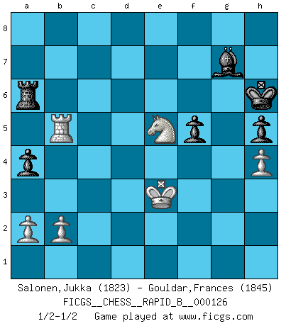 Last move : 1/2-1/2 2009 November 30 17:12:8 [Event "FICGS__CHESS__RAPID_B__000126"] [Site "FICGS"] [Date "2009.09.01"] [Round "1"] [White "Salonen,Jukka"] [Black "Gouldar,Frances"] [Result "1/2-1/2"] [WhiteElo "1823"] [BlackElo "1845"] 1.e4 e5 2.Nf3 Nc6 3.Bb5 d6 4.d4 exd4 5.Nxd4 Bd7 6.Nc3 Nxd4 7.Bxd7+ Qxd7 8.Qxd4 Nf6 9.O-O Be7 10.Rd1 O-O 11.e5 Ne8 12.Bf4 Qc6 13.Nd5 Bd8 14.exd6 Nxd6 15.Re1 Qxc2 16.Rac1 Qg6 17.Qb4 a5 18.Qc5 Ne4 19.Qd4 Ng5 20.Bxg5 Qxg5 21.f4 Qg4 22.Rc3 Qh4 23.Re4 Qh6 24.Rb3 c6 25.Ne3 b5 26.Qc5 Rb8 27.Nf5 Qf6 28.Kf1 Bb6 29.Qe5 Qxe5 30.Rxe5 a4 31.Ne7+ Kh8 32.Rh3 g6 33.Nxc6 Rbc8 34.Rc3 Bc7 35.Rxb5 Bxf4 36.g3 Bh6 37.Rb7 f5 38.Kf2 Bg7 39.Rc4 Rf6 40.Na5 Rxc4 41.Nxc4 Kg8 42.Rb4 Rc6 43.Ke3 Re6+ 44.Kd3 Ra6 45.Rb8+ Kf7 46.Rb7+ Kf8 47.Nb6 g5 48.h3 h5 49.Nc4 Rf6 50.Rb8+ Ke7 51.Rb5 Kf7 52.h4 gxh4 53.gxh4 Kg6 54.Ne5+ Kh6 55.Ke3 Ra6 1/2-1/2 Ruy Lopez : Old Steinitz defense Kingside Castling by player White (move 9) Kingside Castling by player Black (move 10) This chess game ended in a draw. Follow this game move after move (download)The passed Pawn is a criminal, who should be kept under lock and key. Mild measures, such as police surveillance, are not sufficient. (Aaron Nimzovich) Ein Remis kann durch Wiederholung von drei Zügen oder durch einen schlechte Zug erreicht werden. (Savielly Grigorievitsch Tartakower) Bendita sea la memoria de aquel que dio al mundo este juego inmortal. (A. G. Gardiner) On a dit que l'homme se distingue de l'animal par le fait qu'il achète plus de livres qu'il ne peut en lire. Je voudrais suggérer qu'inclure à la liste des livres quelques livres d'échecs rendrait la distinction manifeste. (Edward Lasker) Always remember that you are unique; just like everyone else. (Unknown)