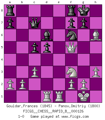 Last move : 1-0 2009 September 7 19:0:7 [Event "FICGS__CHESS__RAPID_B__000126"] [Site "FICGS"] [Date "2009.09.01"] [Round "1"] [White "Gouldar,Frances"] [Black "Panov,Dmitriy"] [Result "1-0"] [WhiteElo "1845"] [BlackElo "1800"] 1.e4 e5 2.Nf3 Nf6 3.Nxe5 d6 4.Nf3 Nxe4 5.d4 d5 6.Nbd2 Nxd2 7.Bxd2 Bd6 8.Bd3 O-O 9.O-O h6 10.c3 Bg4 11.h3 Be6 12.Qb3 b6 13.Rfe1 Nd7 14.Rad1 c5 15.dxc5 bxc5 16.Qc2 Qc7 17.Bf5 Bxf5 18.Qxf5 Nf6 19.Bxh6 1-0 Petrov : Classical attack Kingside Castling by player Black (move 8) Kingside Castling by player White (move 9) Player White won this chess game. Follow this game move after move (download)Life is like a game of Chess, changing with each move. (Chinese proverb) Schach ist ein Reich, wo sich die menschliche Phantasie frei entfalten kann. (David Bronstein) Ciertamente el estado mental actual de Bobby Fischer es una tragedia. Uno de los mas grandes jugadores de Ajedrez del mundo -el orgullo y pena del Ajedrez Americano. (Frank Brady) Les échecs sont un jeu terrible. Si vous n'avez pas le centre, votre adversaire a une position plus libre. Par contre, si vous avez le centre, alors vous avez vraiment quelque chose pour laquelle vous inquiéter ! (Siegbert Tarrasch) In theory there is no difference between theory and practice. In practice there is. (Yogi Berra)