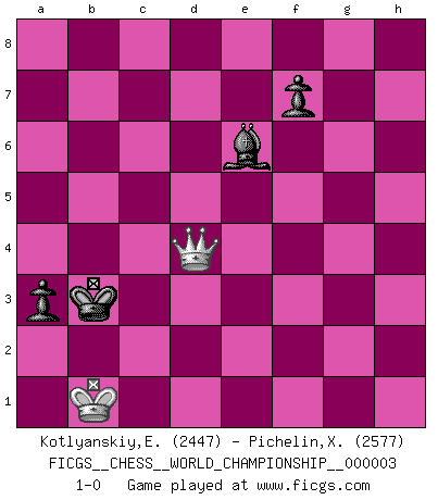 Last move : 1-0 2010 February 5 13:57:53 [Event "FICGS__CHESS__WORLD_CHAMPIONSHIP__000003"] [Site "FICGS"] [Date "2009.09.01"] [Round "2"] [White "Kotlyanskiy,Edward"] [Black "Pichelin,Xavier"] [Result "1-0"] [WhiteElo "2447"] [BlackElo "2577"] 1.e4 c5 2.Nf3 d6 3.d4 cxd4 4.Nxd4 Nf6 5.Nc3 a6 6.Be3 e6 7.f3 b5 8.Qd2 Nbd7 9.a3 Bb7 10.g4 Nb6 11.O-O-O Rc8 12.h4 Nfd7 13.Rh3 Ne5 14.Qe1 Qc7 15.Bg1 h6 16.Kb1 Nbc4 17.a4 bxa4 18.f4 a3 19.fxe5 Nxb2 20.Ncb5 axb5 21.Bxb5+ Kd8 22.exd6 Bxd6 23.e5 Nxd1 24.exd6 Qxd6 25.Rd3 Nc3+ 26.Ka1 Nd5 27.c4 Rg8 28.Be3 g5 29.Bc1 gxh4 30.cxd5 Rxc1+ 31.Qxc1 exd5 32.Qe1 Rxg4 33.Qe8+ Kc7 34.Rc3+ Kb6 35.Ba6 Qb4 36.Rb3 Qxb3 37.Nxb3 Bxa6 38.Qd8+ Kc6 39.Na5+ Kc5 40.Qc7+ Kb5 41.Qd7+ Kxa5 42.Qxg4 Bc4 43.Qxh4 Kb4 44.Qxh6 d4 45.Qd6+ Kb3 46.Qxd4 Be6 47.Kb1 1-0 Philip Roe A fabulous game! White lands one hammer blow after another but Black gets back on to his feet again and again. Finally the White King will walk through the blockage Brian Wood I think Black can at least draw this endgame. Edward Kotlyanskiy Its mate in 20 ;) Brian Wood Let me correct myself, someone at my level of play(USCF 993) can draw this. About 75% of my opponents cant count to 20 without a calculator. Svante Carl von Erichsen Can you outline the basic strategy for the mate? Alexander Marciz God, where did I get: people from 2600 play an elephant against a queen :-))) Sicilian : Najdorf, Byrne (English) attack Queenside Castling by player White (move 11) 10 pieces endgame at move 41 : White KQ , Black KRBPPPPP WHITE : King + 1 Queen BLACK : King + 1 Rook 1 Bishop 5 Pawns 9 pieces endgame at move 42 : White KQ , Black KBPPPPP WHITE : King + 1 Queen BLACK : King + 1 Bishop 5 Pawns 8 pieces endgame at move 43 : White KQ , Black KBPPPP WHITE : King + 1 Queen BLACK : King + 1 Bishop 4 Pawns 7 pieces endgame at move 44 : White KQ , Black KBPPP WHITE : King + 1 Queen BLACK : King + 1 Bishop 3 Pawns 6 pieces endgame at move 46 : White KQ , Black KBPP WHITE : King + 1 Queen BLACK : King + 1 Bishop 2 Pawns Player White won this chess game. Follow this game move after move (download)Excellence at Chess is one mark of a scheming mind. (Sir Arthur Conan Doyle) Ich würde mich als ganz normalen Jungen bezeichnen [Im Alter von 12]. (Sergej Karjakin) El Ajedrez es un regaderazo frío para la mente. (Sir John Simon) Tous ces prétendus hommes politiques sont les pions, les Cavaliers, les Tours ou les Fous d'une partie d'échecs qui se jouera tant qu'un hasard ne renversera pas l'échiquier. (Honoré de Balzac) Hold em is to stud what chess is to checkers. (Johnny Moss)