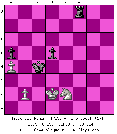 Last move : 0-1 2006 October 21 6:14:53 [Event "FICGS__CHESS__CLASS_C__000014"] [Site "FICGS"] [Date "2006.09.23"] [Round "1"] [White "Hauschild,Achim"] [Black "Riha,Josef"] [Result "0-1"] [WhiteElo "1735"] [BlackElo "1714"] 1.e4 c6 2.Nf3 d5 3.Nc3 Bg4 4.h3 Bh5 5.exd5 cxd5 6.Bb5+ Nc6 7.g4 Bg6 8.Ne5 Rc8 9.d4 e6 10.h4 f6 11.Nxg6 hxg6 12.Qd3 Kf7 13.a3 g5 14.Bd2 gxh4 15.O-O-O Bd6 16.g5 Nge7 17.Kb1 Qb6 18.g6+ Nxg6 19.Rdg1 Nge7 20.Rg4 g5 21.Na4 Qc7 22.Nc3 Ng6 23.Qf3 Bf4 24.Bxf4 Nxf4 25.Ne2 f5 26.Rxf4 gxf4 27.c3 Qb6 28.Bxc6 bxc6 29.Nxf4 c5 30.Qe3 cxd4 31.cxd4 Rb8 32.Qd2 h3 33.Rxh3 Rxh3 34.Nxh3 Qb3 35.Ng5+ Ke7 36.Qe2 Rb6 37.Ka1 Qb5 38.Qxb5 Rxb5 39.Nf3 Rb3 40.Ne5 Rh3 41.Kb1 Rh2 42.Nd3 Kf6 43.Kc2 Kg5 44.Kd2 f4 45.Ke2 Kf5 46.Nc5 Rh3 47.Kd2 e5 48.dxe5 Kxe5 49.a4 Kd4 50.Ne6+ Kc4 51.Nxf4 Rf3 52.Ne2 Rxf2 53.Ke3 Rf8 54.Kd2 a5 0-1 Caro-Kann defense Queenside Castling by player White (move 15) 10 pieces endgame at move 48 : White KNPPP , Black KRPPP WHITE : King + 1 Knight 3 Pawns BLACK : King + 1 Rook 3 Pawns 9 pieces endgame at move 51 : White KNPPP , Black KRPP WHITE : King + 1 Knight 3 Pawns BLACK : King + 1 Rook 2 Pawns 8 pieces endgame at move 52 : White KNPP , Black KRPP WHITE : King + 1 Knight 2 Pawns BLACK : King + 1 Rook 2 Pawns Player Black won this chess game. Follow this game move after move (download)Some part of a mistake is always correct. (Savielly Tartakover) Nur ein wirklich starker Spieler weiß wie schwach er spielt. (Savielly Grigorievitsch Tartakower) El Ajedrez es parte de la cultura, y si una cultura esta en decadencia, entonces también el Ajedrez declinará. (Mikhail Botvinnik) Les Echecs sont et restent toujours un combat, un combat intégral comme la boxe, la lutte ou un autre sport, et où il doit y avoir un vainqueur et un vaincu. (Joseph Emil Diemer) Success without honor is an unseasoned dish; it will satisfy your hunger, but it won't taste good. (Joe Paterno)