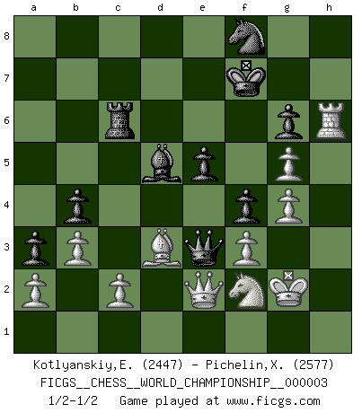 Last move : 1/2-1/2 2009 December 19 19:16:29 [Event "FICGS__CHESS__WORLD_CHAMPIONSHIP__000003"] [Site "FICGS"] [Date "2009.09.01"] [Round "4"] [White "Kotlyanskiy,Edward"] [Black "Pichelin,Xavier"] [Result "1/2-1/2"] [WhiteElo "2447"] [BlackElo "2577"] 1.e4 c5 2.Nf3 d6 3.d4 cxd4 4.Nxd4 Nf6 5.Nc3 a6 6.f3 e5 7.Nb3 Be6 8.Be3 Nbd7 9.g4 b5 10.g5 b4 11.Ne2 Nh5 12.Qd2 a5 13.Ng3 Nxg3 14.hxg3 a4 15.Nc1 Qa5 16.Nd3 d5 17.exd5 Qxd5 18.Kf2 Rc8 19.Rd1 f5 20.Rh4 a3 21.b3 Qa5 22.Kg2 Be7 23.Be2 Rc3 24.Rdh1 Kf7 25.Rxh7 Rxh7 26.Rxh7 Nf8 27.Rh2 Ng6 28.Nf2 Bc5 29.Bxc5 Qxc5 30.Bd3 Bd5 31.Kf1 Qd4 32.Qe2 f4 33.g4 Nf8 34.Rh5 g6 35.Rh6 Rc6 36.Kg2 Qe3 1/2-1/2 Sicilian : Najdorf This chess game ended in a draw. Follow this game move after move (download)Many Chess players were surprised when after the game, Fischer quietly explained: 'I had already analyzed this possibility' in a position which I thought was not possible to foresee from the opening. (Mikhail Tal) Intelligenz läßt sich nicht am Weg, sondern nur am Ergebnis feststellen. (Garry Kasparov) Una victoria por una combinación errónea, aunque sea espectacular, me llena de horror artístico. (Wilhelm Steinitz) Dieu déplace le joueur, et celui-ci la pièce. Quel Dieu derrière Dieu commence donc la trame ? Arturo Perez-Reverte (prix de littérature policière 1993). In every real man a child is hidden that wants to play. (Friedrich Nietzsche)
