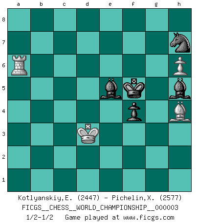 Last move : 1/2-1/2 2010 March 1 18:59:2 [Event "FICGS__CHESS__WORLD_CHAMPIONSHIP__000003"] [Site "FICGS"] [Date "2009.09.01"] [Round "6"] [White "Kotlyanskiy,Edward"] [Black "Pichelin,Xavier"] [Result "1/2-1/2"] [WhiteElo "2447"] [BlackElo "2577"] 1.d4 d5 2.Nf3 Nf6 3.c4 c6 4.Nc3 e6 5.Bg5 h6 6.Bh4 dxc4 7.e4 g5 8.Bg3 b5 9.Be2 Bb7 10.h4 g4 11.Ne5 Nbd7 12.Nxd7 Qxd7 13.Be5 Qe7 14.O-O Rg8 15.Rc1 a6 16.Re1 c5 17.a4 b4 18.Nd5 exd5 19.exd5 O-O-O 20.Bxc4 Nxd5 21.Bd3 Qd7 22.Qc2 Qc6 23.Bf5+ Rd7 24.Bxd7+ Kxd7 25.Qf5+ Qe6 26.Qd3 Qg6 27.Qg3 Kc8 28.dxc5 Qc6 29.Rcd1 Be7 30.Bd6 Bd8 31.Rd4 Nf6 32.Re5 h5 33.Rxb4 Re8 34.f3 a5 35.Rd4 gxf3 36.Qxf3 Qxf3 37.gxf3 Rxe5 38.Bxe5 Nd5 39.Bg3 Bf6 40.Re4 Kd7 41.Be1 Bxb2 42.Bxa5 f5 43.Re2 Bd4+ 44.Kh1 f4 45.Be1 Bxc5 46.Re5 Bd6 47.Rxh5 Nf6 48.Rb5 Bxf3+ 49.Kg1 Bc6 50.Rg5 Bxa4 51.h5 Ke6 52.Bc3 Bc2 53.h6 Nh7 54.Rh5 Bg6 55.Rb5 Bd3 56.Rh5 Be2 57.Ra5 Bc7 58.Ra4 Bd3 59.Bd4 Kd5 60.Bf2 Be5 61.Bh4 Ke6 62.Kf2 Bc2 63.Ra2 Bb3 64.Ra3 Bd1 65.Kf1 Bh5 66.Ra5 Bg6 67.Ke2 Bc3 68.Ra3 Bh5+ 69.Kd3 Be5 70.Ra6+ Kf5 1/2-1/2 Queen's pawn game Kingside Castling by player White (move 14) Queenside Castling by player Black (move 19) 10 pieces endgame at move 48 : White KRBPP , Black KBBNP WHITE : King + 1 Rook 1 Bishop 2 Pawns BLACK : King + 2 Bishops 1 Knight 1 Pawn 9 pieces endgame at move 50 : White KRBP , Black KBBNP WHITE : King + 1 Rook 1 Bishop 1 Pawn BLACK : King + 2 Bishops 1 Knight 1 Pawn This chess game ended in a draw. Follow this game move after move (download)Chess is a fighting game which is purely intellectual and includes chance. (Richard Reti) Ich glaube nicht an Psychologie, ich glaube an gute Züge. (Robert James Fischer) Los tropiezos estan todos ahí en el tablero, esperando que se cometan. (Savielly Tartakover) La solitude du joueur d'Echecs à l'approche du mat est semblable à celle du condamné. (Francis Szpiner) Happy endings are just stories that haven't finished yet. (Jane Smith in Mr & Mrs Smith)