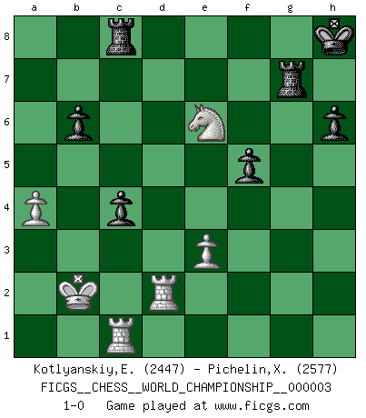 Last move : 1-0 2010 February 5 13:58:30 [Event "FICGS__CHESS__WORLD_CHAMPIONSHIP__000003"] [Site "FICGS"] [Date "2009.09.01"] [Round "8"] [White "Kotlyanskiy,Edward"] [Black "Pichelin,Xavier"] [Result "1-0"] [WhiteElo "2447"] [BlackElo "2577"] 1.d4 Nf6 2.c4 e6 3.Nf3 b6 4.g3 Ba6 5.b3 Bb4+ 6.Bd2 Be7 7.Bg2 c6 8.O-O d5 9.Bc3 Nbd7 10.Nbd2 O-O 11.Qc2 Rc8 12.e4 Qc7 13.Rac1 Rfd8 14.Rfd1 Ba3 15.Rb1 c5 16.Ba1 cxd4 17.exd5 exd5 18.b4 dxc4 19.Qa4 Bxb4 20.Qxa6 Bxd2 21.Rxd2 d3 22.Rc1 Qc5 23.Bd4 Qd5 24.Be3 Ne4 25.R2d1 f5 26.Nd4 Kh8 27.Qxa7 f4 28.gxf4 Ra8 29.Bxe4 Qxe4 30.Qc7 Rac8 31.Qd6 Nf6 32.Qe5 Qg6+ 33.Qg5 Qe4 34.Qf5 Qb7 35.a4 Re8 36.Qh3 Nd5 37.Nb5 Rc6 38.f5 Nxe3 39.fxe3 Qe7 40.Nd4 R6c8 41.Ne6 g6 42.Nf4 Qg5+ 43.Kf2 gxf5 44.Qh5 h6 45.Qf7 Qh4+ 46.Kf1 Rg8 47.Rxd3 Qg5 48.Rd2 Qg1+ 49.Ke2 Qxh2+ 50.Kd1 Qh1+ 51.Kc2 Qe4+ 52.Kb2 Rg7 53.Qe6 Qxe6 54.Nxe6 1-0 Thibault de Vassal Very nice (and complex) game, definitely... Queen's Indian : Nimzovich variation (exaggerated Fianchetto) Kingside Castling by player White (move 8) Kingside Castling by player Black (move 10) Player White won this chess game. Follow this game move after move (download)Best by test: 1. e4 (Bobby Fischer) Was ist der Unterschied zwischen einem Strassenarbeiter und einem Schachspieler? --Der Schachspieler bewegt sich ab und zu. (Anonymous) Botvinnik trató de alejar el misterio referente al Ajedrez, siempre relacionandolo a situaciones de la vida diaria. Solía llamar al Ajedrez un problema inexacto típico, similar a aquellos en que la gente tiene siempre que resolver a cada día. (Garry Kasparov) Les Echecs sont affaire de jugement sensible. Savoir quand frapper et quand esquiver. (Fischer) A good teacher is like a candle - it consumes itself to light the way for others. (Author unknown)