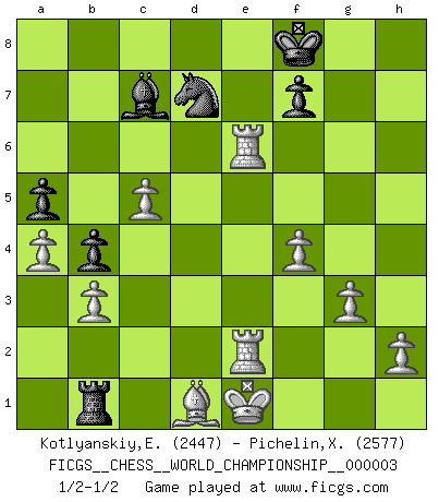 Last move : 1/2-1/2 2010 January 15 14:4:25 [Event "FICGS__CHESS__WORLD_CHAMPIONSHIP__000003"] [Site "FICGS"] [Date "2009.09.01"] [Round "10"] [White "Kotlyanskiy,Edward"] [Black "Pichelin,Xavier"] [Result "1/2-1/2"] [WhiteElo "2447"] [BlackElo "2577"] 1.e4 e5 2.Nf3 Nc6 3.Bb5 a6 4.Ba4 Nf6 5.O-O Be7 6.Re1 b5 7.Bb3 O-O 8.c3 d5 9.exd5 Nxd5 10.Nxe5 Nxe5 11.Rxe5 c6 12.d4 Bd6 13.Re1 Qh4 14.g3 Qh3 15.Re4 g5 16.Qf1 Qxf1+ 17.Kxf1 Bf5 18.Nd2 h6 19.Re1 Rae8 20.Nf3 g4 21.Bxh6 gxf3 22.Bxf8 Rxf8 23.Bd1 Bg4 24.a4 b4 25.c4 Nf6 26.c5 Bc7 27.Re3 Bh3+ 28.Kg1 Rd8 29.Bxf3 Rxd4 30.Bxc6 Be6 31.Bf3 Nd7 32.Rc1 Rd2 33.b3 a5 34.Kf1 Kf8 35.Ke1 Rb2 36.Bd1 Ne5 37.f4 Nc6 38.Rc2 Rb1 39.Rd2 Nb8 40.Rde2 Nd7 41.Rxe6 1/2-1/2 Ruy Lopez : Closed, 7...O-O Kingside Castling by player White (move 5) Kingside Castling by player Black (move 7) This chess game ended in a draw. Follow this game move after move (download)We cannot resist the fascination of sacrifice, since a passion for sacrifices is part of a Chessplayer's nature. (Rudolf Spielman) Das Schach hält seine Meister in eigenen Banden, Fesseln; auf vielerlei Weise formt es ihren Geist, so dass die innere Freiheit selbst des Stärksten beeinflusst wird. (Albert Einstein) La caracteristica mas importante en la posición del Ajedrez es la actividad de las piezas. Esto es absolutamente fundamental en todas las fases del juego: Apertura, Juego Medio y especialmente Finales. La limitación primordial en la actividad de una pieza, es la estructuración de los Peones. (Michael Stean) Pour moi, les échecs ne sont pas un jeu mais un art. (Alexandre Alekhine) Good decisions come from experience, and experience comes from bad decisions. (Anonymous)