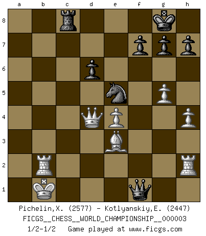 Last move : 1/2-1/2 2010 January 9 11:38:46 [Event "FICGS__CHESS__WORLD_CHAMPIONSHIP__000003"] [Site "FICGS"] [Date "2009.09.01"] [Round "11"] [White "Pichelin,Xavier"] [Black "Kotlyanskiy,Edward"] [Result "1/2-1/2"] [WhiteElo "2577"] [BlackElo "2447"] 1.e4 c5 2.Nf3 d6 3.d4 cxd4 4.Nxd4 Nf6 5.Nc3 a6 6.Be3 e5 7.Nb3 Be6 8.f3 Be7 9.Qd2 O-O 10.O-O-O Nbd7 11.g4 b5 12.g5 b4 13.Ne2 Ne8 14.f4 a5 15.f5 a4 16.Nbd4 exd4 17.Nxd4 b3 18.Kb1 bxc2+ 19.Nxc2 Bb3 20.axb3 Ne5 21.Bc4 Nd7 22.Bf1 axb3 23.Na3 Ne5 24.h4 Ra4 25.Rh3 Qa8 26.Qd5 Rxa3 27.bxa3 Qxa3 28.Rd2 Nc7 29.Qb7 Qa5 30.Qa7 Qc3 31.Qd4 Qc6 32.f6 Rc8 33.fxe7 Nb5 34.e8Q+ Qxe8 35.Bxb5 Qxb5 36.Rf2 b2 37.R3h2 Qa6 38.Rxb2 Qf1+ 39.Ka2 Ra8+ 40.Kb3 Qb5+ 41.Kc2 Rc8+ 42.Kb1 Qf1+ 1/2-1/2 Sicilian : Najdorf, Byrne (English) attack Kingside Castling by player Black (move 9) Queenside Castling by player White (move 10) Promotion Queen by player White (move 34) This chess game ended in a draw. Follow this game move after move (download)You sit at the board and suddenly your heart leaps. Your hand trembles to pick up the piece and move it. But what Chess teaches you is that you must sit there calmly and think about whether it's really a good idea and whether there are other better ideas. (Stanley Kubrick) Alle Schachspieler sollten auch ein Hobby haben. (Savielly Grigorievitsch Tartakower) El Ajedrez es un cuento de Hadas de las 1001 metidas de pata. (Savielly Tartakower) Le génie consiste à savoir transgresser les règles au moment opportun. (Teichmann) When a man with money meets a man with experience, the man with experience leaves with money and the man with money leaves with experience. (Anonymous)