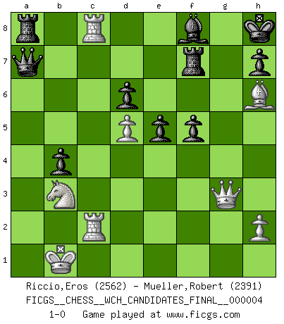 Last move : 1-0 2009 October 10 12:37:34 [Event "FICGS__CHESS__WCH_CANDIDATES_FINAL__000004"] [Site "FICGS"] [Date "2009.09.01"] [Round "1"] [White "Riccio,Eros"] [Black "Mueller,Robert"] [Result "1-0"] [WhiteElo "2562"] [BlackElo "2391"] 1.e4 c5 2.Nf3 d6 3.d4 cxd4 4.Nxd4 Nf6 5.Nc3 a6 6.Be3 e5 7.Nb3 Be6 8.f3 Be7 9.Qd2 O-O 10.O-O-O Nbd7 11.g4 b5 12.g5 b4 13.Ne2 Ne8 14.f4 a5 15.f5 Bxb3 16.cxb3 a4 17.bxa4 Rxa4 18.Kb1 Rxa2 19.Nc1 Ra8 20.Nb3 Qc7 21.Bb5 Nb6 22.f6 gxf6 23.Rc1 Qa7 24.Rc6 Qa2+ 25.Kc2 Na4 26.Rb1 fxg5 27.Bc4 Nxb2 28.Rxb2 Qa4 29.Bd5 Nf6 30.Bxg5 Nxd5 31.exd5 f6 32.Bh6 Rf7 33.Kb1 Kh8 34.Qd3 f5 35.Rbc2 Qa7 36.Rc8+ Bf8 37.Qg3 1-0 Sicilian : Najdorf, Byrne (English) attack Kingside Castling by player Black (move 9) Queenside Castling by player White (move 10) Player White won this chess game. Follow this game move after move (download)The Pawns are the soul of the game. (Francois Andre Danican Philidor) Wenn es im Universum noch irgendwo intelligente Lebewesen gibt, dann kennen sie Go. (Emanuel Lasker) Las leyes del Ajedrez no permiten una libre elección: tienes que mover quieras o no. (Emanuel Lasker) Je ne crois pas en la psychologie, je crois aux bons coups. (Robert Fischer) If you don't practice you don't deserve to win. (Andre Agassi)