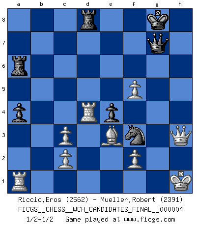 Last move : 1/2-1/2 2009 November 7 8:39:59 [Event "FICGS__CHESS__WCH_CANDIDATES_FINAL__000004"] [Site "FICGS"] [Date "2009.09.01"] [Round "5"] [White "Riccio,Eros"] [Black "Mueller,Robert"] [Result "1/2-1/2"] [WhiteElo "2562"] [BlackElo "2391"] 1.e4 c5 2.Nf3 d6 3.d4 cxd4 4.Nxd4 Nf6 5.Nc3 a6 6.g3 e5 7.Nde2 Be7 8.Bg2 O-O 9.O-O Be6 10.h3 Nbd7 11.a4 Qc7 12.a5 h6 13.g4 b5 14.axb6 Nxb6 15.Re1 a5 16.Ng3 a4 17.Nf5 Bxf5 18.exf5 d5 19.h4 h5 20.g5 Ng4 21.Bf3 Bb4 22.Bxg4 hxg4 23.Qxg4 Bxc3 24.bxc3 Qd7 25.h5 Nc4 26.Rd1 Rfd8 27.g6 e4 28.Be3 Ne5 29.Qh3 Nf3+ 30.Kh1 Ra6 31.gxf7+ Qxf7 32.h6 d4 33.hxg7 Qxg7 34.Rxd4 1/2-1/2 Sicilian : Najdorf, Zagreb (Fianchetto) variation Kingside Castling by player Black (move 8) Kingside Castling by player White (move 9) This chess game ended in a draw. Follow this game move after move (download)The chessboard is the world, the pieces are the phenomena of the Universe, the rules of the game are what we call the laws of Nature and the player on the other side is hidden from us. (Thomas Huxley) Es macht mich traurig, wenn ich sehe, dass Golfprofis mehr verdienen als Schachsportler. Obwohl ich davon überzeugt bin, dass wir Schachspieler viel härter trainieren müssen als die Golfer. (Alexandra Kosteniuk) El sobresalir en el Ajedrez es un signo de una mente intrigante. (Sir Arthur Conan Doyle) Le joueur d'Echecs qui veut atteindre le top est obligé de développer son propre credo créatif. Alexeï Stepanovicth Souétine. Il est facile d'écrire des livres ! Ce qui est difficile, c'est de jouer ! (Alexeï Stepanovicth Souétine) Just because you do not take an interest in politics doesn't mean politics won't take an interest in you. (Pericles 430 B.C.)