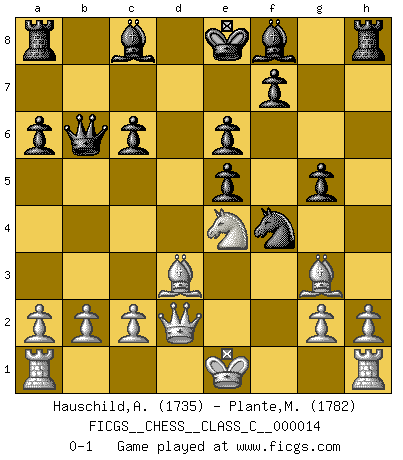 Last move : 0-1 2007 January 8 11:6:31 [Event "FICGS__CHESS__CLASS_C__000014"] [Site "FICGS"] [Date "2006.09.23"] [Round "1"] [White "Hauschild,Achim"] [Black "Plante,Marc-Eric"] [Result "0-1"] [WhiteElo "1735"] [BlackElo "1782"] 1.e4 c5 2.Nf3 d6 3.d4 cxd4 4.Nxd4 Nf6 5.Nc3 a6 6.Bg5 e6 7.f4 Nc6 8.Nxc6 bxc6 9.e5 h6 10.Bh4 g5 11.fxg5 Nd5 12.Ne4 Qb6 13.Bd3 hxg5 14.Bg3 Nf4 15.Qd2 dxe5 0-1 Sicilian : Najdorf, 7.f4 Player Black won this chess game. Follow this game move after move (download)Chess is thirty to forty percent psychology. You don't have this when you play a computer. I can't confuse it. (Judith Polgar) Spielt Blackmar-Diemer-Gambit, und das Matt kommt von selbst! (Emil Joseph Diemer) Observen a Garry Kasparov. Después de una derrota, invariablemente el gana la próxima partida. Prácticamente hace pedazos a su siguiente oponente. Eso es algo que tenemos que aprender a lograr. (Maurice Ashley) Les échecs sont un jeu par leur forme, un art par leur essence et une science par sa difficulté d'acquisition. Ils peuvent vous procurer autant de plaisir qu'un bon livre ou une belle musique, mais vous n'aurez une réelle joie que si vous arrivez à bien jouer. (Tigran Petrosian) Good decisions come from experience, and experience comes from bad decisions. (Anonymous)