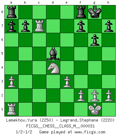 Last move : 1/2-1/2 2010 January 7 13:40:12 [Event "FICGS__CHESS__CLASS_M__000031"] [Site "FICGS"] [Date "2009.09.01"] [Round "1"] [White "Lemekhov,Yura"] [Black "Legrand,Stephane"] [Result "1/2-1/2"] [WhiteElo "2250"] [BlackElo "2220"] 1.d4 Nf6 2.c4 e6 3.Nc3 d5 4.Nf3 Be7 5.Bf4 O-O 6.e3 Nbd7 7.a3 c5 8.cxd5 Nxd5 9.Nxd5 exd5 10.dxc5 Nxc5 11.Be5 Bf6 12.Bxf6 Qxf6 13.Qd4 Qd6 14.Bd3 Nxd3+ 15.Qxd3 Qf6 16.O-O Qxb2 17.Qxd5 Be6 18.Qe4 Qb5 19.Nd4 Qd5 20.Qxd5 Bxd5 21.Rfc1 g6 22.Rc7 1/2-1/2 Queen's pawn game Kingside Castling by player Black (move 5) Kingside Castling by player White (move 16) This chess game ended in a draw. Follow this game move after move (download)After a bad opening, there is hope for the middle game. After a bad middle game, there is hope for the endgame. But once you are in the endgame, the moment of truth has arrived. (Edmar Mednis) Zu meiner Zeit war ein 20 jähriger ein junger Spieler, heute ist er ein Veteran. (Garry Kasparov) El Ajedrez es un juego de pelea el cual es puramente intelectual e incluye la suerte. (Richard Reti) Celui qui prend des risques peut perdre, celui qui n'en prend pas perd toujours. (Xavier Tartacover) There are three kinds of lies: lies, damned lies and statistics. (Mark Twain)