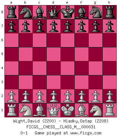 Last move : 0-1 2009 October 11 20:47:53 [Event "FICGS__CHESS__CLASS_M__000031"] [Site "FICGS"] [Date "2009.09.01"] [Round "1"] [White "Wight,David"] [Black "Hladky,Ostap"] [Result "0-1"] [WhiteElo "2200"] [BlackElo "2208"] 0-1 This chess game has been lost on time (started : 2009.09.01 17:40:40) Player Black won this chess game. Follow this game move after move (download)Modern Chess is too much concerned with things like Pawn structure. Forget it, Checkmate ends the game. (Nigel Short) Man gibt nur Pakete auf. (Paul Keres) Nunca nadie ha ganado una partida de Ajedrez rindiendose. (Unknown) Le génie consiste à savoir transgresser les règles au moment opportun. (Teichmann) True nature is revealed in times of difficulty. (Chinese proverb)