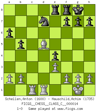Last move : 1-0 2007 January 8 17:9:42 [Event "FICGS__CHESS__CLASS_C__000014"] [Site "FICGS"] [Date "2006.09.23"] [Round "1"] [White "Schellen,Anton"] [Black "Hauschild,Achim"] [Result "1-0"] [WhiteElo "1600"] [BlackElo "1735"] 1.d4 d5 2.Bf4 Nf6 3.Nf3 e6 4.e3 Bd6 5.Bxd6 Qxd6 6.Nbd2 c5 7.dxc5 Qxc5 8.c4 O-O 9.Be2 b6 10.cxd5 Qxd5 11.Nd4 e5 12.Nb5 Qd7 13.Nf3 e4 14.Ne5 Qf5 15.Qd4 Ba6 16.O-O Bxb5 17.Bxb5 a6 18.Ba4 b5 19.Bc2 Qe6 20.Bb3 Qe8 21.Rac1 Nbd7 22.Nxd7 Qxd7 23.Qxd7 Nxd7 24.Bd5 Rae8 25.Rfd1 1-0 Queen's pawn, Mason variation Kingside Castling by player Black (move 8) Kingside Castling by player White (move 16) Player White won this chess game. Follow this game move after move (download)It is difficult to play against Einstein's theory --on his first loss to Fischer. (Mikhail Tal) Ich verstehe den Grund nicht, warum die Aufteilung in Frauen und Männer überhaupt im Schach besteht. (Judith Polgar) Bobby es la celebridad menos entendida y malinterpretada que camina el la faz de esta tierra. (Yasser Seirawan) Le génie consiste à savoir transgresser les règles au moment opportun. (Teichmann) The next best thing to gambling and winning is gambling and loosing. (Nick Dandalos)