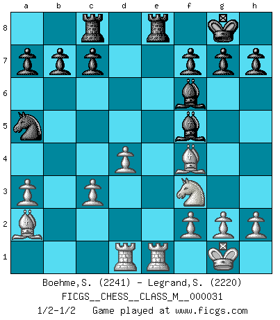 Last move : 1/2-1/2 2010 April 22 22:40:45 [Event "FICGS__CHESS__CLASS_M__000031"] [Site "FICGS"] [Date "2009.09.01"] [Round "1"] [White "Boehme,Sebastian"] [Black "Legrand,Stephane"] [Result "1/2-1/2"] [WhiteElo "2241"] [BlackElo "2220"] 1.e4 e5 2.Nf3 Nf6 3.Nxe5 d6 4.Nf3 Nxe4 5.d4 d5 6.Bd3 Be7 7.O-O Nc6 8.c4 Nb4 9.Be2 O-O 10.Nc3 Bf5 11.a3 Nxc3 12.bxc3 Nc6 13.cxd5 Qxd5 14.Re1 Rfe8 15.Bf4 Rac8 16.Qc1 Bf6 17.Qb2 Na5 18.Rad1 Qb3 19.Qxb3 Nxb3 20.Bc4 Na5 21.Ba2 1/2-1/2 Petrov : Classical attack Kingside Castling by player White (move 7) Kingside Castling by player Black (move 9) This chess game ended in a draw. Follow this game move after move (download)Could we look into the head of a Chess player, we should see there a whole world of feelings, images, ideas, emotion and passion. (Alfred Binet) Es hat in meinem Leben Zeiten gegeben, in denen das Schachspiel, wenn nicht zum Lebenszweck, so doch zu einem regelrechten Lebensersatz geworden ist. Man fühlt sich in solchen Zeiten nicht so, als besäße man eine göttliche Gabe, sondern eher so, als sei man von ihr besessen. (Garry Kasparov) Si tu oponente te ofrece un empate, trata de averiguar porque piensa él que esta en una posición peor. (Nigel Short) Un millionnaire : 'Monsieur Steinitz ! Vous ne participez aux tournois que pour l'argent, alors que moi je n'y viens que pour l'honneur.' Steinitz : 'Chacun joue pour ce qu'il n'a pas'... There's always a bigger fish. (Qui-Gon Jinn in Star Wars ep.1)