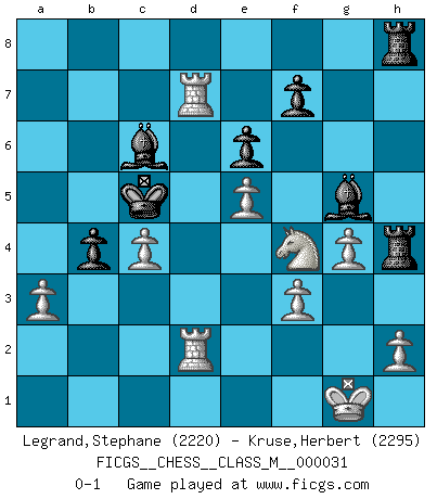 Last move : 0-1 2010 March 13 6:38:59 [Event "FICGS__CHESS__CLASS_M__000031"] [Site "FICGS"] [Date "2009.09.01"] [Round "1"] [White "Legrand,Stephane"] [Black "Kruse,Herbert"] [Result "0-1"] [WhiteElo "2220"] [BlackElo "2295"] 1.d4 Nf6 2.c4 e6 3.Nf3 d5 4.Nc3 c6 5.Bg5 h6 6.Bh4 dxc4 7.e4 g5 8.Bg3 b5 9.Be2 Bb7 10.O-O Nbd7 11.Ne5 h5 12.Nxd7 Qxd7 13.Be5 Rh6 14.Qc1 Ng4 15.Bxg4 hxg4 16.Qxg5 Rg6 17.Qe3 c5 18.Rad1 b4 19.Ne2 cxd4 20.Bxd4 Qc7 21.Nf4 Rh6 22.Rfe1 O-O-O 23.Qe2 Bd6 24.e5 Be7 25.Qxg4 Rh4 26.Qg3 R4h8 27.Bxa7 Rdg8 28.Qe3 Bg5 29.f3 Rh4 30.Rd4 Bd5 31.g4 Rgh8 32.Re2 Kb7 33.b3 Qa5 34.Red2 Qxa7 35.bxc4 Qc5 36.a3 Bc6 37.Rd7+ Kb6 38.Qxc5+ Kxc5 0-1 This chess game has been lost on time (started : 2009.09.01 17:40:40) Queen's pawn game Kingside Castling by player White (move 10) Queenside Castling by player Black (move 22) Player Black won this chess game. Follow this game move after move (download)Live, lose, and learn, by observing your opponent how to win. (Amber Steenbock) Alle offensichtlichen Züge sehen nach dem Spiel in der Analyse verdächtig aus. (Viktor Kortschnoi) Los libros de Ajedrez deben de usarse igual como usamos los anteojos: para mejorar la vista, aunque algunos jugadores los quieren usar como si ellos les otorgaran la vision. (José Raúl Capablanca) Le joueur d'Echecs qui veut atteindre le top est obligé de développer son propre credo créatif. Alexeï Stepanovicth Souétine. Il est facile d'écrire des livres ! Ce qui est difficile, c'est de jouer ! (Alexeï Stepanovicth Souétine) Who needs drugs and alcohol if he can play Big Chess at FICGS ? (Heinz-Georg Lehnhoff)