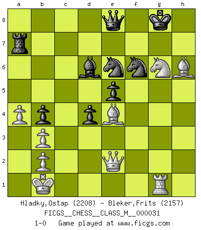 Last move : 1-0 2010 March 26 11:18:18 [Event "FICGS__CHESS__CLASS_M__000031"] [Site "FICGS"] [Date "2009.09.01"] [Round "1"] [White "Hladky,Ostap"] [Black "Bleker,Frits"] [Result "1-0"] [WhiteElo "2208"] [BlackElo "2157"] 1.e4 c5 2.Nf3 d6 3.d4 cxd4 4.Nxd4 Nf6 5.Nc3 a6 6.Be3 e5 7.Nb3 Be7 8.f3 Be6 9.Qd2 O-O 10.O-O-O Nbd7 11.g4 b5 12.g5 b4 13.Ne2 Ne8 14.f4 a5 15.f5 a4 16.fxe6 axb3 17.cxb3 fxe6 18.Bh3 Nc7 19.Kb1 d5 20.exd5 exd5 21.Bg2 Ra5 22.a4 Rf7 23.Rhe1 Bd6 24.h4 Qf8 25.h5 Kh8 26.Ng3 d4 27.g6 Rf6 28.Bg5 Rf2 29.Re2 Rxe2 30.Qxe2 Qe8 31.gxh7 Ne6 32.Bd2 Ra7 33.Nf5 Bf8 34.Nh4 Bd6 35.Ng6+ Kxh7 36.Be4 Kg8 37.h6 gxh6 38.Bxh6 Nf6 39.Rg1 1-0 Sicilian : Najdorf, Byrne (English) attack Kingside Castling by player Black (move 9) Queenside Castling by player White (move 10) Player White won this chess game. Follow this game move after move (download)Help your pieces so they can help you. (Paul Morphy) Je mehr ich von der FIDE weiss, um so weniger verstehe ich. (Alexander Kalifman) El Ajedrez es un juego de pelea el cual es puramente intelectual e incluye la suerte. (Richard Reti) Il n'y a pas eu de défaite parce que je ne crois pas que cet ordinateur ait jamais existé. IBM a triché en refusant d'imprimer les modes de recherche de la machine. C'est évident, pendant le match, des coups décisifs ont été joués par des êtres humains. Aujourd'hui, les meilleurs spécialistes en informatique ne peuvent toujours pas expliquer comment Deep-Blue a pu jouer contre la logique des ordinateurs. IBM a gagné une guerre de communication, mais ils sont incapables de prouver que l'ordinateur a gagné tout seul. (Garry Kasparov) You cannot beat a roulette table unless you steal money from it. (Albert Einstein)