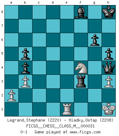 Last move : 0-1 2010 July 25 7:24:50 [Event "FICGS__CHESS__CLASS_M__000031"] [Site "FICGS"] [Date "2009.09.01"] [Round "1"] [White "Legrand,Stephane"] [Black "Hladky,Ostap"] [Result "0-1"] [WhiteElo "2220"] [BlackElo "2208"] 1.d4 Nf6 2.c4 g6 3.Nf3 Bg7 4.g3 O-O 5.Bg2 d6 6.O-O Nbd7 7.Nc3 e5 8.e4 c6 9.b3 exd4 10.Nxd4 Nc5 11.h3 Re8 12.Re1 h6 13.Bb2 a5 14.Rb1 Qb6 15.Ba3 Nfd7 16.Nde2 Ne5 17.Rf1 Ned3 18.Qd2 Qc7 19.Na4 Nb4 20.Nec3 Be6 21.f4 Nxa4 22.Nxa4 b5 23.cxb5 cxb5 24.f5 Bc8 25.f6 Bf8 26.Nc3 d5 27.Nxd5 Qxg3 28.Rf3 Qd6 29.Rd3 Qe5 30.Bxb4 axb4 31.Qb2 Qb8 32.Re1 Ra6 33.Kh1 Bb7 34.e5 h5 35.Rd2 Kh7 36.Qd4 Rd6 37.Rd3 Qc8 38.Qh4 Rc6 39.Qg3 Rc2 40.Nf4 Bxg2+ 41.Nxg2 Rd8 42.Rxd8 Qxd8 43.e6 fxe6 44.Qe5 Rf2 45.Qxe6 Rxf6 46.Qe5 Rf3 47.Nf4 Qh4 48.Qh8+ Kxh8 0-1 This chess game has been lost on time (started : 2009.09.01 17:40:40) King's Indian, 3.Nf3 Kingside Castling by player Black (move 4) Kingside Castling by player White (move 6) Player Black won this chess game. Follow this game move after move (download)Play the opening like a book, the middle game like a magician, and the endgame like a machine. (Spielmann) Moralische Siege zählen nicht. (Savielly Grigorievitsch Tartakower) Tu cuerpo tiene que estar en óptima condición. Tu Ajedrez se deteriora como lo hace tu cuerpo. No puedes separar la mente y el cuerpo. (Bobby Fischer) Les ravages du H expliquent la différence de niveau entre Tal et Thal [Abergel]. All art requires courage. (Anne Tucker)
