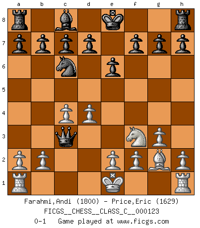 Last move : 0-1 2009 November 29 8:58:20 [Event "FICGS__CHESS__CLASS_C__000123"] [Site "FICGS"] [Date "2009.09.01"] [Round "1"] [White "Farahmi,Andi"] [Black "Price,Eric"] [Result "0-1"] [WhiteElo "1800"] [BlackElo "1629"] 1.d4 Nf6 2.c4 e6 3.Nf3 Bb4+ 4.Bd2 Qe7 5.g3 Nc6 6.Bg2 Bxd2+ 7.Qxd2 Ne4 8.Qc2 Qb4+ 9.Nc3 Nxc3 10.Qxc3 Qxc3+ 0-1 This chess game has been lost on time (started : 2009.09.01 21:23:24) Bogo-Indian defense, Nimzovich variation Player Black won this chess game. Follow this game move after move (download)I'd rather have a Pawn than a finger. (Reuben Fine) Die Elozahlen sind sehr schlecht für das Schach. Jetzt ist Schach eine Sportindustrie, die darauf zielt Elopunkte zu machen. (Miguel Najdorf) Yo creo que el Ajedrez posee una magia que es también una ayuda en la edad avanzada. Una rodilla reumática es olvidada durante una partida de Ajedrez y otros eventos pueden parecer algo sin importancia comparada a una catástrofe en el tablero de Ajedrez. (Vlastimil Hort) Les échecs sont utiles à l'exercice de la faculté de penser et à celle de l'imagination. Car nous devons posséder une méthode élaborée pour atteindre des buts partout où nous devons conduire notre raison. (Leibnitz) The project of the man are lower than those of the sky. (Chinese proverb)