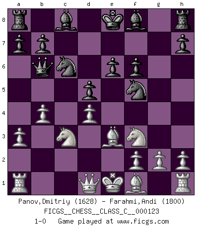 Last move : 1-0 2009 November 27 8:52:14 [Event "FICGS__CHESS__CLASS_C__000123"] [Site "FICGS"] [Date "2009.09.01"] [Round "1"] [White "Panov,Dmitriy"] [Black "Farahmi,Andi"] [Result "1-0"] [WhiteElo "1628"] [BlackElo "1800"] 1.e4 e6 2.d4 d5 3.e5 c5 4.c3 Nc6 5.Nf3 Nge7 6.a3 Nf5 7.b4 cxd4 8.cxd4 Qb6 9.Be3 f6 10.exf6 gxf6 11.Nc3 1-0 This chess game has been lost on time (started : 2009.09.01 21:23:24) French : Advance, Paulsen attack Player White won this chess game. Follow this game move after move (download)If cunning alone were needed to excel, women would be the best Chess players. (Albin) Ohne Fehler kann es keine Brillanz geben. (Emanuel Lasker) Uno por uno, yo los acribillé, mi superioridad muy pronto se volvio aparente. (Jose Capablanca) Les réformistes prétendent que les progrès de la théorie conduiront à la disparition des échecs, et qu'il faut, pour leur rendre vie, en remanier les règles. En réalité, qu'exprime cette affirmation? Le mépris de l'intuition, de l'imagination et de tous les autres éléments qui font des échecs un art. (Alexander Alekhine) Heh, heh, heh. Time to abandon ship. (General Grievous in Star Wars ep.3)