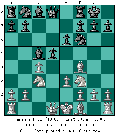 Last move : 0-1 2009 November 14 20:53:14 [Event "FICGS__CHESS__CLASS_C__000123"] [Site "FICGS"] [Date "2009.09.01"] [Round "1"] [White "Farahmi,Andi"] [Black "Smith,John"] [Result "0-1"] [WhiteElo "1800"] [BlackElo "1800"] 1.d4 d5 2.c4 e6 3.Nf3 Nf6 4.Nc3 Be7 5.Bf4 O-O 6.e3 c5 7.dxc5 Bxc5 0-1 This chess game has been lost on time (started : 2009.09.01 21:23:24) Queen's gambit declined Kingside Castling by player Black (move 5) Player Black won this chess game. Follow this game move after move (download)The beauty of a move lies not in its' appearance but in the thought behind it. (Siegbert Tarrasch) Rauchen ist dem Schachspieler bei seiner Arbeit, also im Wettkampf, untersagt. (Viktor Kortschnoi) La última cosa en que Fischer estaba interesado era en tonterías, siempre y cuando el Ajedrez estuviera involucrado. (Elie Agur) Seul un grand joueur sait à quel point il joue faiblement. (Xavier Tartacover) First of all, we have to go back to the classical time control. (Anatoly Karpov)