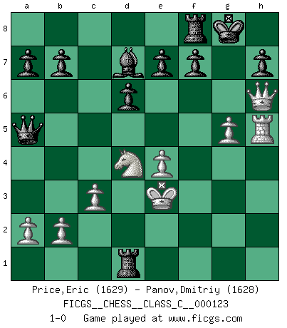 Last move : 1-0 2009 September 7 16:59:56 [Event "FICGS__CHESS__CLASS_C__000123"] [Site "FICGS"] [Date "2009.09.01"] [Round "1"] [White "Price,Eric"] [Black "Panov,Dmitriy"] [Result "1-0"] [WhiteElo "1629"] [BlackElo "1628"] 1.e4 c5 2.Nf3 d6 3.d4 cxd4 4.Nxd4 Nf6 5.Nc3 g6 6.Be3 Bg7 7.f3 O-O 8.Qd2 Nc6 9.Bc4 Bd7 10.O-O-O Rc8 11.Bb3 Ne5 12.h4 Nc4 13.Bxc4 Rxc4 14.h5 Nxh5 15.g4 Nf6 16.Bh6 Bxh6 17.Qxh6 Rxc3 18.g5 Nh5 19.Rxh5 gxh5 20.Rh1 Rxf3 21.Rxh5 Rf1+ 22.Kd2 Qa5+ 23.c3 Rd1+ 24.Ke3 1-0 Sicilian : Dragon, Yugoslav attack, 7...O-O Kingside Castling by player Black (move 7) Queenside Castling by player White (move 10) Player White won this chess game. Follow this game move after move (download)Every Pawn is a potential Queen. (James Mason) Schach ist Kampf, hauptsächlich jedoch gegen die eigenen Fehler. (Savielly Grigorievitsch Tartakower) Yo jugué Ajedrez con el y a veces le pude haber ganado solo que siempre devuelve su última jugada y juega la partida de manera diferente. (Mark Twain) Les Echecs sont et restent toujours un combat, un combat intégral comme la boxe, la lutte ou un autre sport, et où il doit y avoir un vainqueur et un vaincu. (Joseph Emil Diemer) Think like a man of action, act like a man of thought. (Henri Louis Bergson)