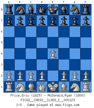 Last move : 1-0 2009 October 12 8:48:47 [Event "FICGS__CHESS__CLASS_C__000123"] [Site "FICGS"] [Date "2009.09.01"] [Round "1"] [White "Price,Eric"] [Black "McDonald,Ryan"] [Result "1-0"] [WhiteElo "1629"] [BlackElo "1800"] 1.e4 1-0 This chess game has been lost on time (started : 2009.09.01 21:23:24) King's pawn Opening Player White won this chess game. Follow this game move after move (download)There is no remorse like the remorse of Chess. (H. G. Wells) Ich verstehe Aljechins Kombinationen ganz gut; aber woher er diese Angriffschancen bekommt und wie er die Eröffnung behandelt das ist für mich ein Buch mit sieben Siegeln. (Rudolf Spielmann) Observen a Garry Kasparov. Después de una derrota, invariablemente el gana la próxima partida. Prácticamente hace pedazos a su siguiente oponente. Eso es algo que tenemos que aprender a lograr. (Maurice Ashley) À la honte des hommes, on sait que les lois du jeu sont les seules qui soient partout justes, claires, inviolables et exécutées. Pourquoi l'Indien qui a donné les règles du jeu d'échecs est-il obéi de bon gré dans toute la terre, et que les décrétales des papes, par exemple, sont aujourd'hui un objet d'horreur et de mépris ? C'est que l'inventeur des échecs combina tout avec justesse pour la satisfaction des joueurs, et que les papes, dans leurs décrétales, n'eurent en vue que leur seul avantage. L'Indien voulut exercer également l'esprit des hommes et leur donner du plaisir; les papes ont voulu abrutir l'esprit des hommes. Voltaire (Dictionnaire philosophique / Garnier 1967) Yoga is 99% practice and 1% knowledge. (Sri Krishna Pattabhi Jois)