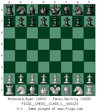 Last move : 0-1 2009 October 12 8:48:47 [Event "FICGS__CHESS__CLASS_C__000123"] [Site "FICGS"] [Date "2009.09.01"] [Round "1"] [White "McDonald,Ryan"] [Black "Panov,Dmitriy"] [Result "0-1"] [WhiteElo "1800"] [BlackElo "1628"] 0-1 This chess game has been lost on time (started : 2009.09.01 21:23:24) Player Black won this chess game. Follow this game move after move (download)Later, I began to succeed in decisive games. Perhaps because I realized a very simple truth: not only was I worried, but also my opponent. (Mikhail Tal) Glücklicherweise sind Großmeister Ruben Fines reine Schachbücher weniger phallozentrisch [als seine Schachpsychologie] und deswegen auch weniger lächerlich. (Nigel Short) Una mala movida nulifica cuarenta buenas. (Horowitz) Un millionnaire : 'Monsieur Steinitz ! Vous ne participez aux tournois que pour l'argent, alors que moi je n'y viens que pour l'honneur.' Steinitz : 'Chacun joue pour ce qu'il n'a pas'... Now be brave and don't look back. Don't look back. (Shmi Skywalker in Star Wars ep.1)