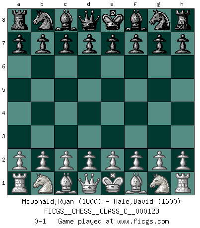 Last move : 0-1 2009 October 12 8:48:47 [Event "FICGS__CHESS__CLASS_C__000123"] [Site "FICGS"] [Date "2009.09.01"] [Round "1"] [White "McDonald,Ryan"] [Black "Hale,David"] [Result "0-1"] [WhiteElo "1800"] [BlackElo "1600"] 0-1 This chess game has been lost on time (started : 2009.09.01 21:23:24) Player Black won this chess game. Follow this game move after move (download)There just isn't enough televised Chess. (David Letterman) Eine Person mit durchschnittlichem IQ kann etwa eine ELO von 2000 erreichen. (Jonathan Levitt) Un sacrificio se refuta mucho mejor al aceptarlo. (Wilhelm Steinitz) Demandez au pauvre Cg1 ce qu'il en pense. Eduard Gufeld à propos de la variante Saemisch de l'Est-Indienne. Your best chance to get a Royal Flush in a casino is in the bathroom. (Anonymous)