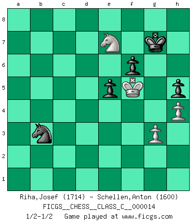 Last move : 1/2-1/2 2006 November 2 19:3:33 [Event "FICGS__CHESS__CLASS_C__000014"] [Site "FICGS"] [Date "2006.09.23"] [Round "1"] [White "Riha,Josef"] [Black "Schellen,Anton"] [Result "1/2-1/2"] [WhiteElo "1714"] [BlackElo "1600"] 1.g3 e5 2.Bg2 d5 3.Nf3 Nc6 4.d3 Nf6 5.O-O Be7 6.c4 O-O 7.cxd5 Nxd5 8.a3 Re8 9.Nc3 Be6 10.Bd2 Qd7 11.Rc1 f6 12.Nxd5 Bxd5 13.Be3 Nd8 14.Nh4 Ne6 15.Bxd5 Qxd5 16.Qa4 Bf8 17.Qg4 Rad8 18.Rc4 c5 19.b4 cxb4 20.axb4 b5 21.Re4 Qa2 22.Rc1 a5 23.bxa5 b4 24.Nf5 Kh8 25.Qh3 Rd7 26.Nh4 Kg8 27.Qg4 Qxa5 28.Bd2 Rb7 29.Rc8 Nd8 30.Rec4 Qb5 31.Bc1 Ne6 32.R4c6 Rb8 33.Rxe8 Rxe8 34.Nf5 Kh8 35.Qe4 b3 36.Bb2 Ng5 37.Qc4 Qxc4 38.dxc4 Rb8 39.c5 Ne4 40.Rb6 Rxb6 41.cxb6 Bc5 42.b7 Bxf2+ 43.Kg2 Ba7 44.Ne7 Nd6 45.Nc6 Nxb7 46.Nxa7 Nd6 47.Kf3 Nc4 48.Bc1 b2 49.Bxb2 Nxb2 50.Ke4 Kg8 51.Nb5 Kf7 52.Kd5 Nd1 53.Nd6+ Ke7 54.Nf5+ Kf8 55.Ke6 Nc3 56.e3 Ne4 57.Kd5 Nf2 58.e4 g6 59.Nd6 Ke7 60.Nc8+ Ke8 61.Nb6 Kf7 62.Nc4 Ng4 63.h3 Nf2 64.Nd6+ Ke7 65.h4 h5 66.Nc8+ Kd7 67.Nb6+ Ke7 68.Nc8+ Ke8 69.Ke6 Nxe4 70.Ne7 Kf8 71.Nxg6+ Kg7 72.Ne7 Nc5+ 73.Kf5 Nb3 1/2-1/2 Benko's Opening Kingside Castling by player White (move 5) Kingside Castling by player Black (move 6) 10 pieces endgame at move 69 : White KNPP , Black KNPPPP WHITE : King + 1 Knight 2 Pawns BLACK : King + 1 Knight 4 Pawns 9 pieces endgame at move 71 : White KNPP , Black KNPPP WHITE : King + 1 Knight 2 Pawns BLACK : King + 1 Knight 3 Pawns This chess game ended in a draw. Follow this game move after move (download)In Fischer's hands, a slight theoretical advantage is as good a being a Queen ahead. (Isaac Kashdan) Die Arbeit ist etwas Unnatürliches. Die Faulheit allein ist göttlich. (Anatole France) El Ajedrez es parte de una cultura y si una cultura esta en decadencia, entonces también el Ajedrez declinará. (Mikhail Botvinnik) Si rien de grave n'est détecté lors de l'analyse d'une position, on joue alors le coup. Seconde règle de Blumenfeld. There are two kinds of tragedy in this world, one is not getting what you want and the other is getting. (Lord of war)