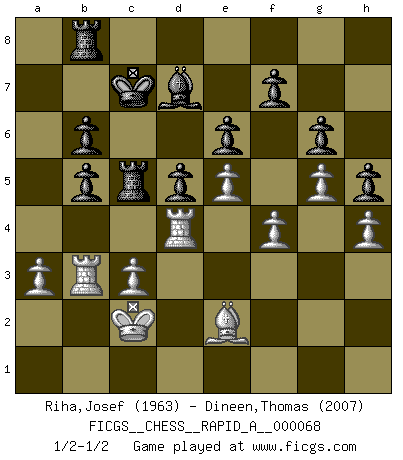 Last move : 1/2-1/2 2009 September 21 15:32:0 [Event "FICGS__CHESS__RAPID_A__000068"] [Site "FICGS"] [Date "2009.09.01"] [Round "1"] [White "Riha,Josef"] [Black "Dineen,Thomas"] [Result "1/2-1/2"] [WhiteElo "1963"] [BlackElo "2007"] 1.e4 e6 2.d4 d5 3.Nc3 Nf6 4.Bg5 Bb4 5.e5 h6 6.Bd2 Bxc3 7.bxc3 Ne4 8.Qg4 g6 9.Qf4 c5 10.Bd3 Nxd2 11.Qxd2 Qa5 12.f4 Nc6 13.Nf3 Bd7 14.a3 Rc8 15.Ra2 Qb6 16.Kf2 cxd4 17.cxd4 Nxd4 18.Qe3 Nxf3 19.Qxb6 axb6 20.Kxf3 Rc5 21.Rb1 b5 22.Rab2 O-O 23.Rb4 b6 24.h4 Ra8 25.R1b3 Kg7 26.Ke3 Rac8 27.g4 h5 28.g5 R8c7 29.Kd2 Kf8 30.Kc1 Ra7 31.c3 Ke7 32.Kb2 Ra5 33.Kc2 Kd8 34.Bf1 Bc6 35.Kd2 Kc7 36.Kd1 Kb7 37.Kd2 Ra8 38.Ke3 Rc8 39.Be2 Bd7 40.Kd2 Kc7 41.Rd4 Rb8 42.Kc2 1/2-1/2 French : MacCutcheon, Lasker variation Kingside Castling by player Black (move 22) This chess game ended in a draw. Follow this game move after move (download)Suddenly it was obvious to me in my analysis I had missed what Fischer had found with the greatest of ease at the board. (Mikhail Botvinnik) Kombinieren und Schwarzhandel gehören verboten. (Savielly Grigorievitsch Tartakower) El Ajedrez moderno está demasiado preocupado con cosas como la estructura de Peones. Olvidenlo, el Jaque Mate termina la partida. (Nigel Short) Le profane ne songe pas à la somme de jouissance dont il se prive, qui méconnaît ce jeu aux ressources aussi variées que passionnantes. (Jean-Marie Jeanton-Lamarche) Man is reluctant to give credit for intelligence to anyone, except his enemies. (Albert Einstein)
