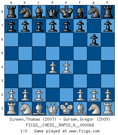 Last move : 1-0 2009 October 3 8:48:19 [Event "FICGS__CHESS__RAPID_A__000068"] [Site "FICGS"] [Date "2009.09.01"] [Round "1"] [White "Dineen,Thomas"] [Black "Gorsek,Gregor"] [Result "1-0"] [WhiteElo "2007"] [BlackElo "2009"] 1.d4 g6 2.e4 1-0 This chess game has been lost on time (started : 2009.09.01 23:10:28) Modern defense Player White won this chess game. Follow this game move after move (download)Chess is above all, a fight ! (Emanuel Lasker) Es war undenkbar für die Behörden, dass ein sowjetischer Großmeister auf diese Art und Weise [Fischer-Taimanov 6:0] verliert, ohne dass es eine politischer Erklärung dafür gäbe. (Mark Taimanov) Realmente no sabemos como el juego fue inventado, aunque hay sospechas. Tan pronto como descubramos a los culpables, se los haremos saber. (Bruce Pandolfini) Lorsque vous vous retrouvez devant une position atroce, ne tendez pas un ultime piège dérisoire avec l'intention d'abandonner si l'adversaire le déjoue ! Faites-vous plutôt un devoir de résister comme si votre vie en dépendait. Jouez le coup qui vous déplairait au centuple si vous étiez dans la peau de votre tortionnaire ! Even the best needles are not sharp at both ends. (Chinese proverb)