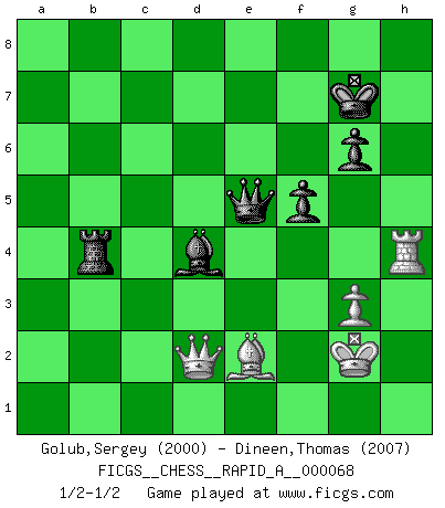 Last move : 1/2-1/2 2010 March 25 16:58:15 [Event "FICGS__CHESS__RAPID_A__000068"] [Site "FICGS"] [Date "2009.09.01"] [Round "1"] [White "Golub,Sergey"] [Black "Dineen,Thomas"] [Result "1/2-1/2"] [WhiteElo "2000"] [BlackElo "2007"] 1.d4 Nf6 2.c4 e6 3.Nc3 Bb4 4.e3 O-O 5.Nge2 d5 6.a3 Bd6 7.c5 Be7 8.b4 b6 9.Nf4 a5 10.Bd2 c6 11.Be2 Ba6 12.Nd3 Nbd7 13.O-O Qc7 14.cxb6 Nxb6 15.bxa5 Nc4 16.Nb4 Nxd2 17.Nxa6 Rxa6 18.Qxd2 Rxa5 19.a4 Bb4 20.Qd3 Rc8 21.Rfb1 Qe7 22.Rb3 c5 23.dxc5 Bxc5 24.g3 g6 25.Qd2 Qd8 26.Rc1 R5a8 27.Bb5 d4 28.exd4 Bxd4 29.Rd1 e5 30.Kg2 Qb6 31.f3 Qe6 32.Rdb1 Kg7 33.Ne2 Ba7 34.Nc3 h5 35.Bd3 h4 36.Ne4 Nxe4 37.Bxe4 Rd8 38.Rd3 Be3 39.Qe2 Rxd3 40.Bxd3 Bd4 41.Bc4 Qf5 42.Bd3 Qg5 43.Rf1 Rxa4 44.f4 exf4 45.Rxf4 hxg3 46.hxg3 Qd5+ 47.Qf3 Qd7 48.Qg4 Qd8 49.Be2 Rb4 50.Qf3 f5 51.Qd3 Qd5+ 52.Kh2 Kf7 53.Rh4 Qe5 54.Kg2 Kg7 55.Qd2 1/2-1/2 Nimzo-Indian : 4.e3 O-O Kingside Castling by player Black (move 4) Kingside Castling by player White (move 13) This chess game ended in a draw. Follow this game move after move (download)In blitz, the Knight is stronger than the Bishop. (Vlastimil Hort) Im Leben werden Partien nie so unstrittig gewonnen wie im Spiel (Emanuel Lasker) Las ideas audaces son como las piezas del Ajedrez que avanzan hacia adelante. Ellas pueden ser vencidas, pero también pueden iniciar una partida victoriosa. (Goethe) Le système Elo représente seulement une moyenne. Il est simplement un indicateur de votre stabilité. (Anatoli Karpov) Philosophers use a language that is already deformed as though by shoes that are too tight. (Ludwig Wittgenstein)